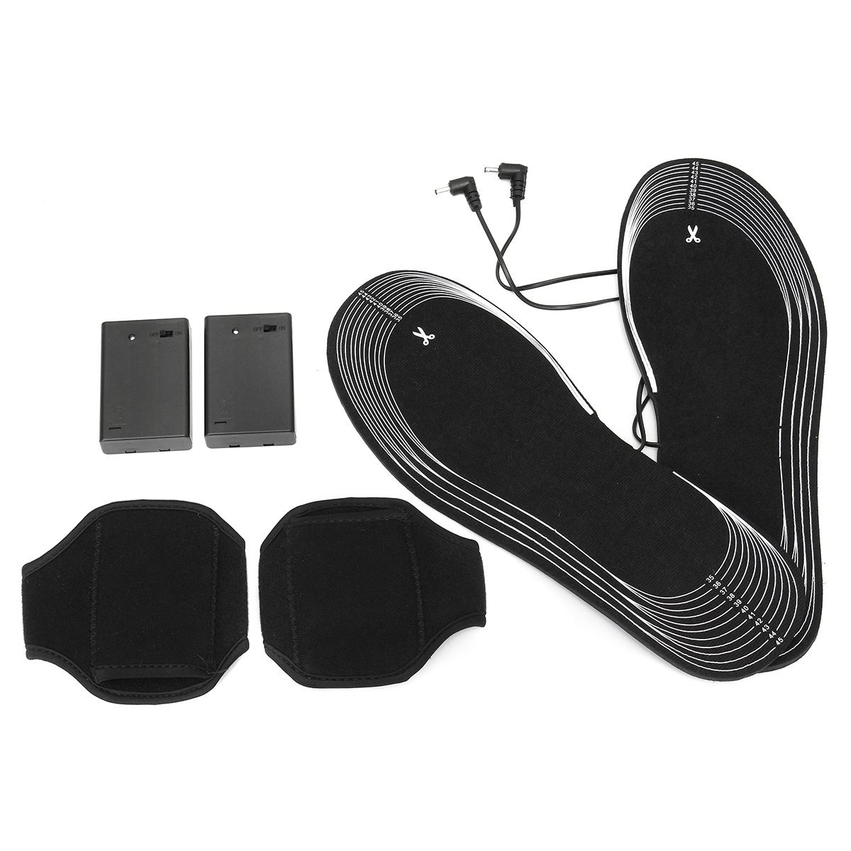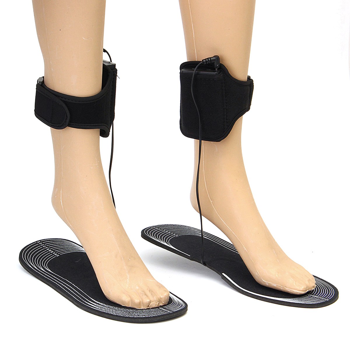 - Insoles connected to battery pack contained inside mesh fabric pouch which securely fastens around leg with strap