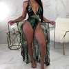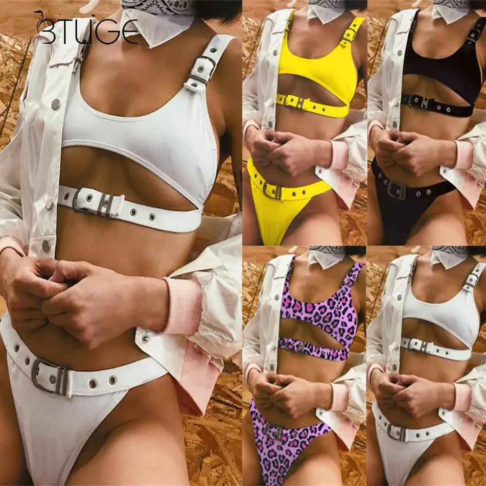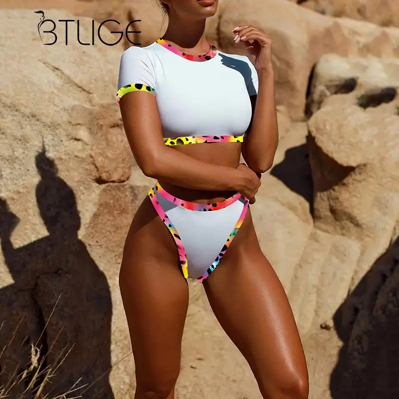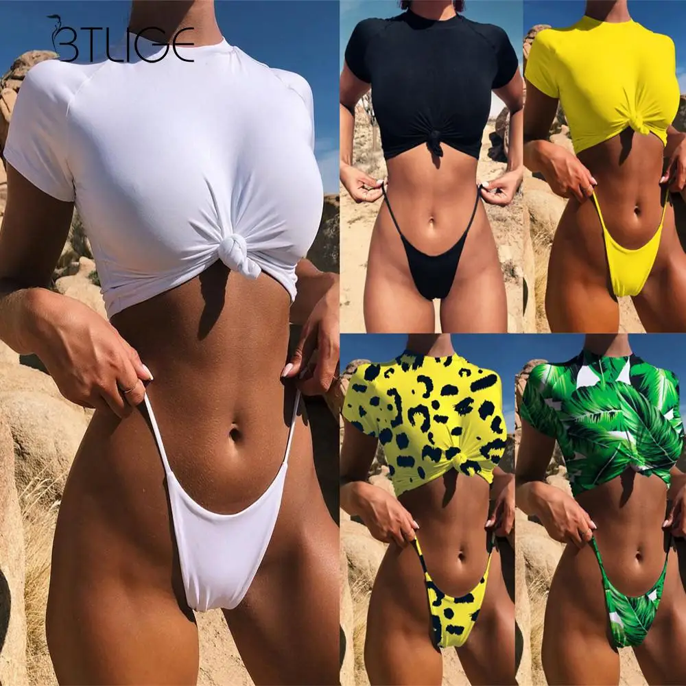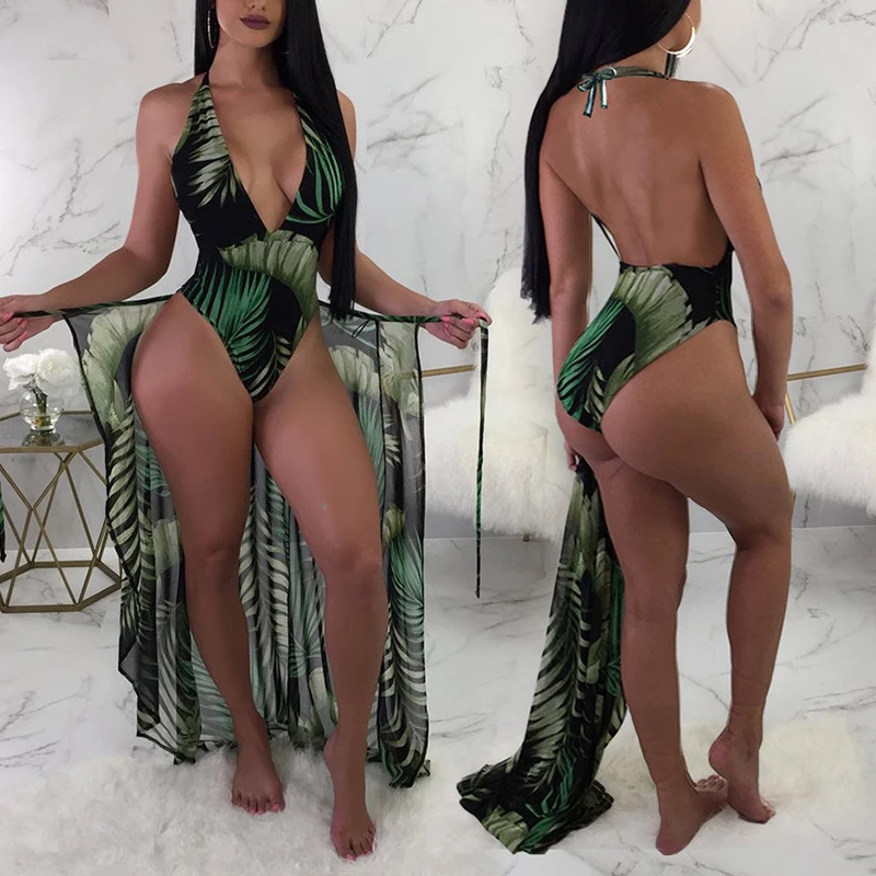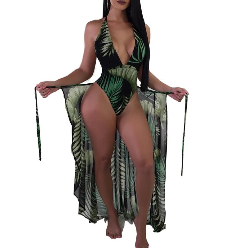 BTLIGE Brazilian One Piece Swimsuit Summer High Cut Beach Bodysuit+Bikini Cover Up Leaves Print Halter 2PCS Swimwear High Waist