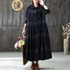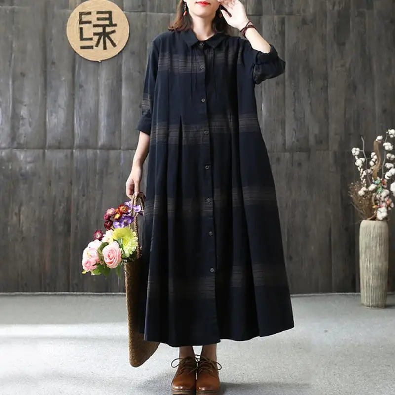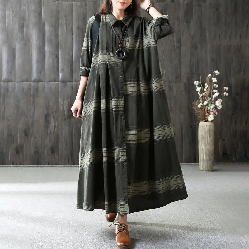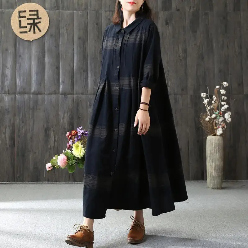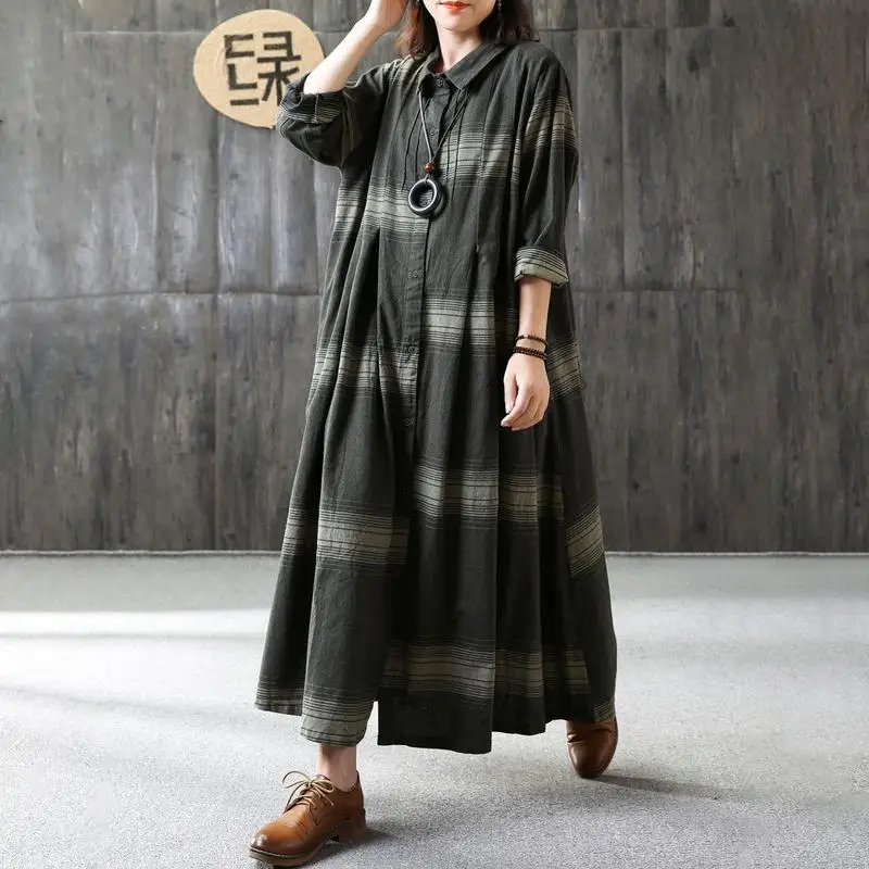 BUYKUD Casual Draped Pleated Maxi Dresses Cotton Stand Collar Long Sleeve Office Lady Linen Dress Elegant Loose Plus Size Dress
