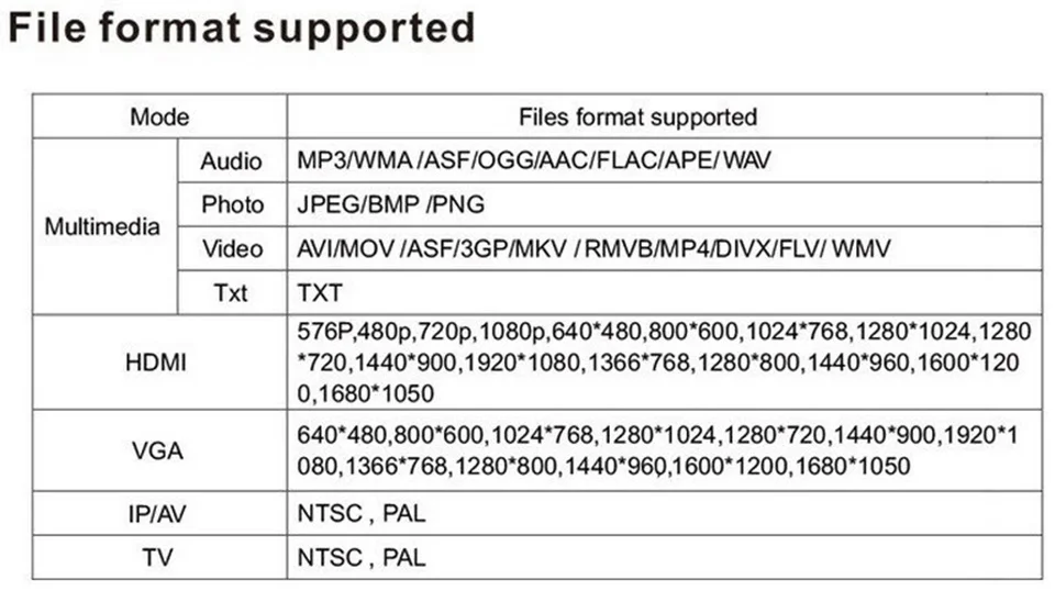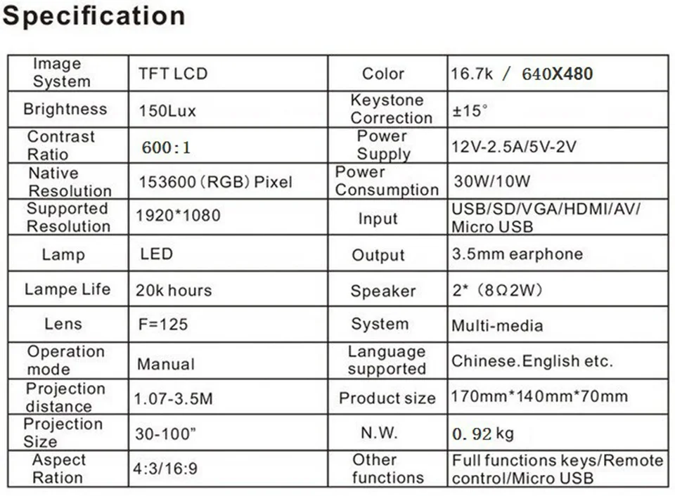 | Input | USB/ SD/ VGA/ HDMI/ AV |