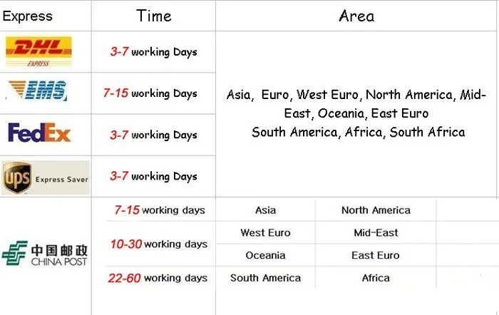 4, China Post Air Mail is” free shipping “, also DHL, TNT, FEDEX, EMS, ARAMEX etc. acceptable based on agreed cost.