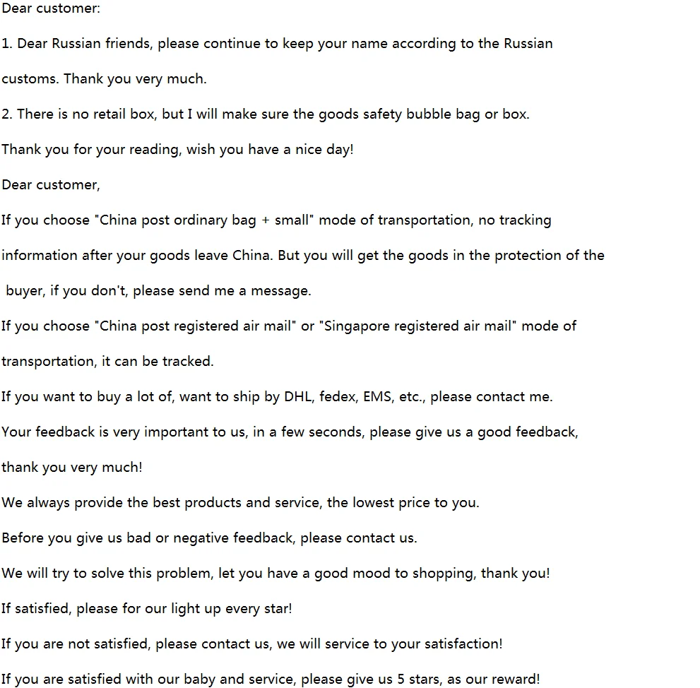 • If you did not receive the product within the guaranteed time( 45 days not including 2-5 day processing) you can request a refund or a reshipment.