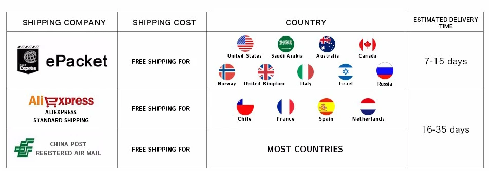Packages from our warehouse in China will be shipped by ePacket or EMS depending on the weight and size of the product. Packages shipped from our US warehouse are shipped through USPS.