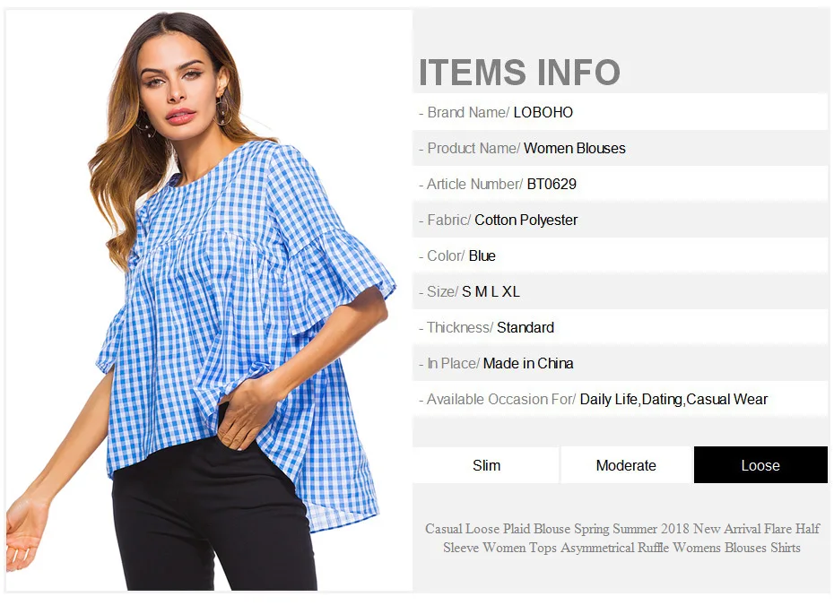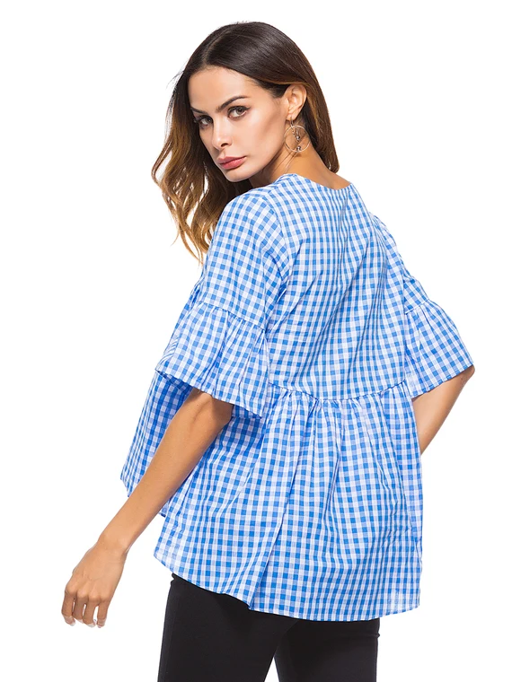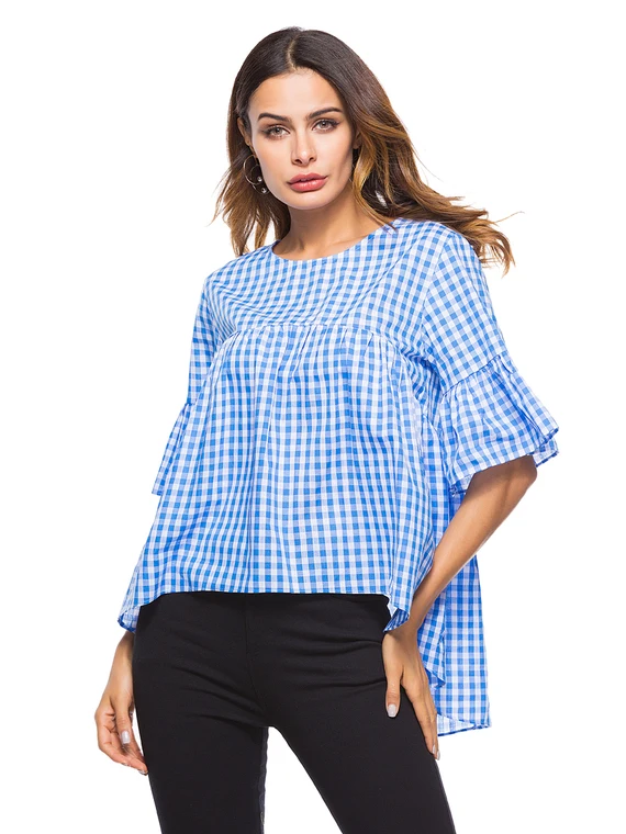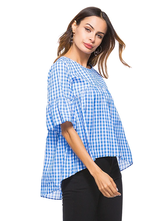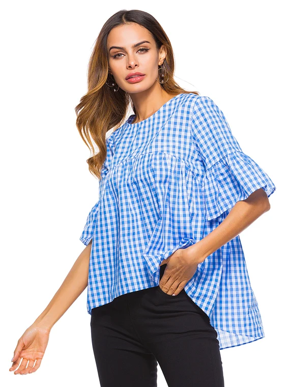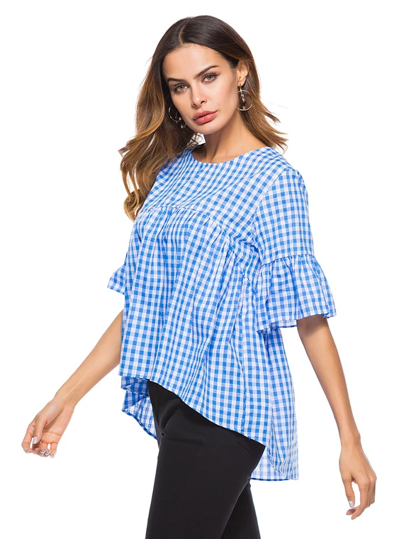 Casual Loose Plaid Blouse Spring Summer 2018 New Arrival Flare Half Sleeve Women Tops Asymmetrical Ruffle Womens Blouses Shirts