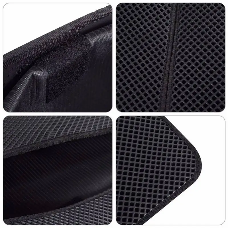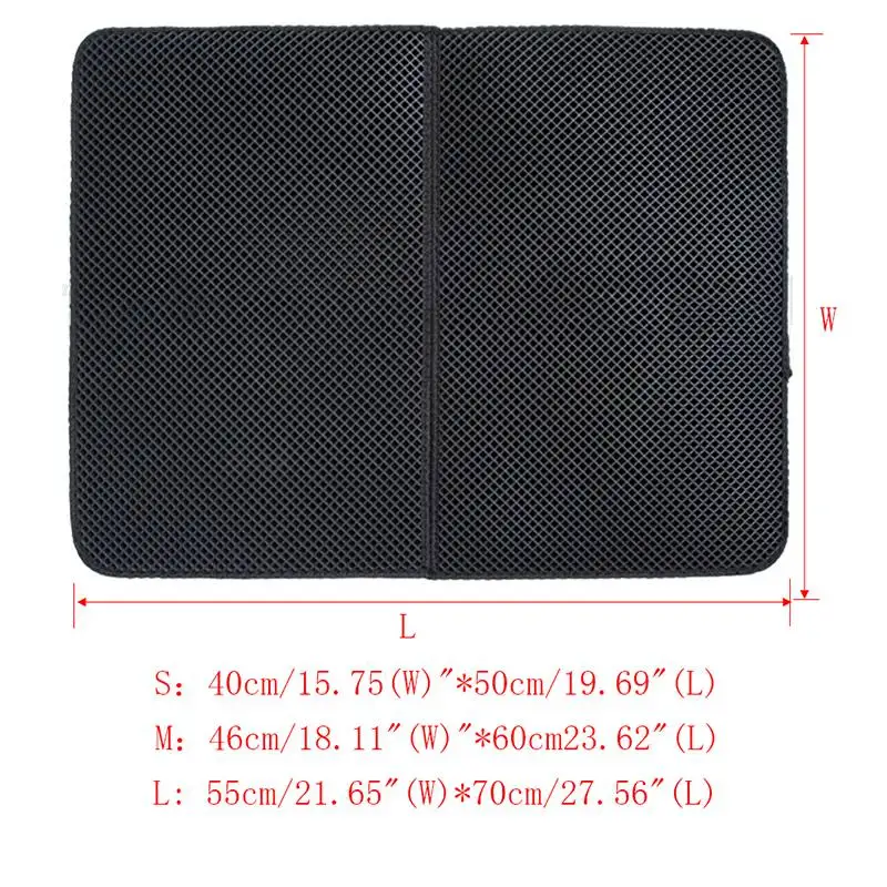 1.While it is a lightweight and easy to clean cat litter pad, it is also durable and not easily broken 2.EVA pet pad brings high elasiticy, making it easy to carry when you are travelling with your pet 3.Smooth surface will not easily trap your pet’s claw 4.Double layer design with hook and loop fastener. The first layer comes with uneven anti slip durable surface, while the second layer comes with flat TPE rubber foamed material 5.The bottom is designed with concave part to ensure its anti slip feature 6.As a litter mat, its top layer with holes can capture cat litter into the bottom layer easily, and the waterproof bottom layer will storage the cat litter and urine such things, making it easier to clean 7.No more litter on everything. Gets a cleaner sofa, table, floor, and even your bed. Places this mat under where your pet toilet stands and solve the problem from the source