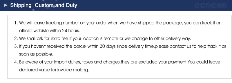 We are not responsible for any custom fees once the items have shipped. By purchasing our products, you consent that one or more packages may be shipped to you and may get custom fees when they arrive in your country.