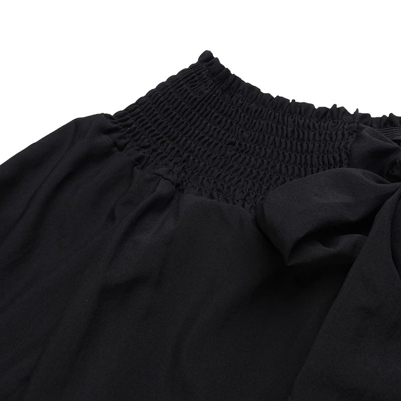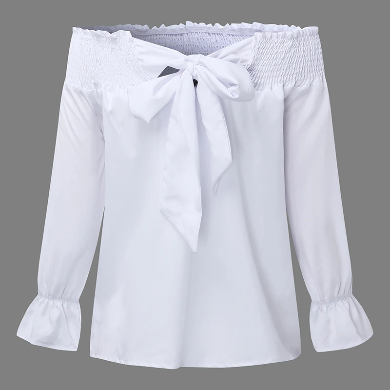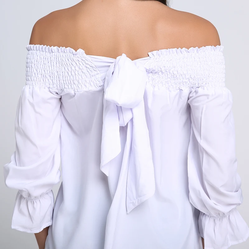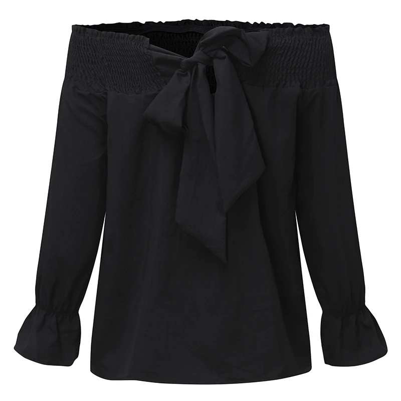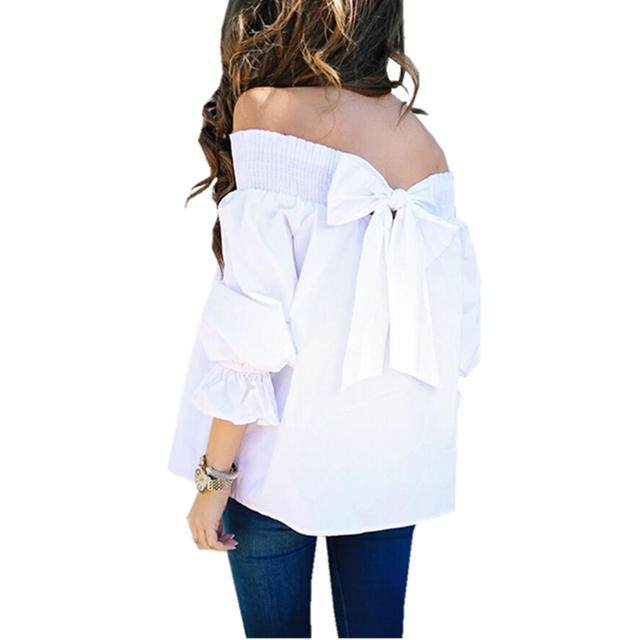 Product Description: Womens Off Shoulder 3/4 Sleeve Ruffle Cuffs Back Bowknot Tie Casual Tops
