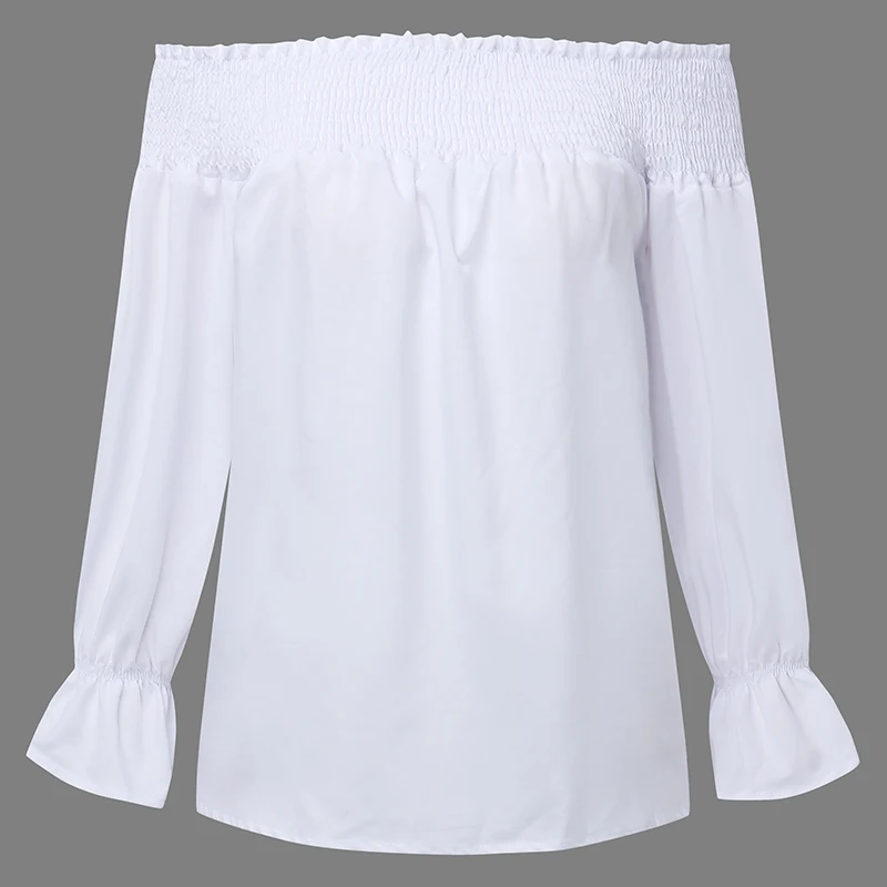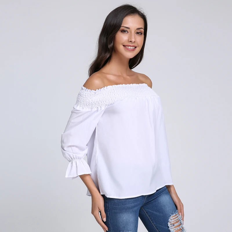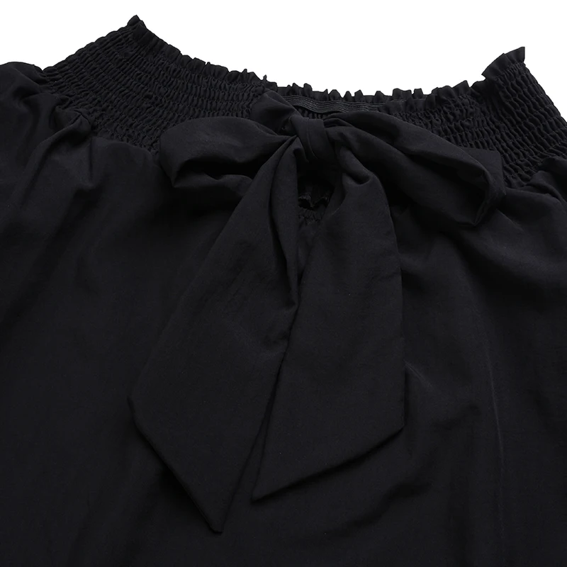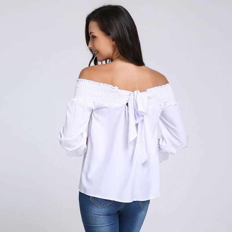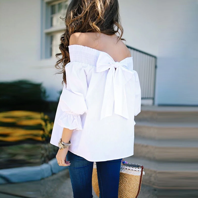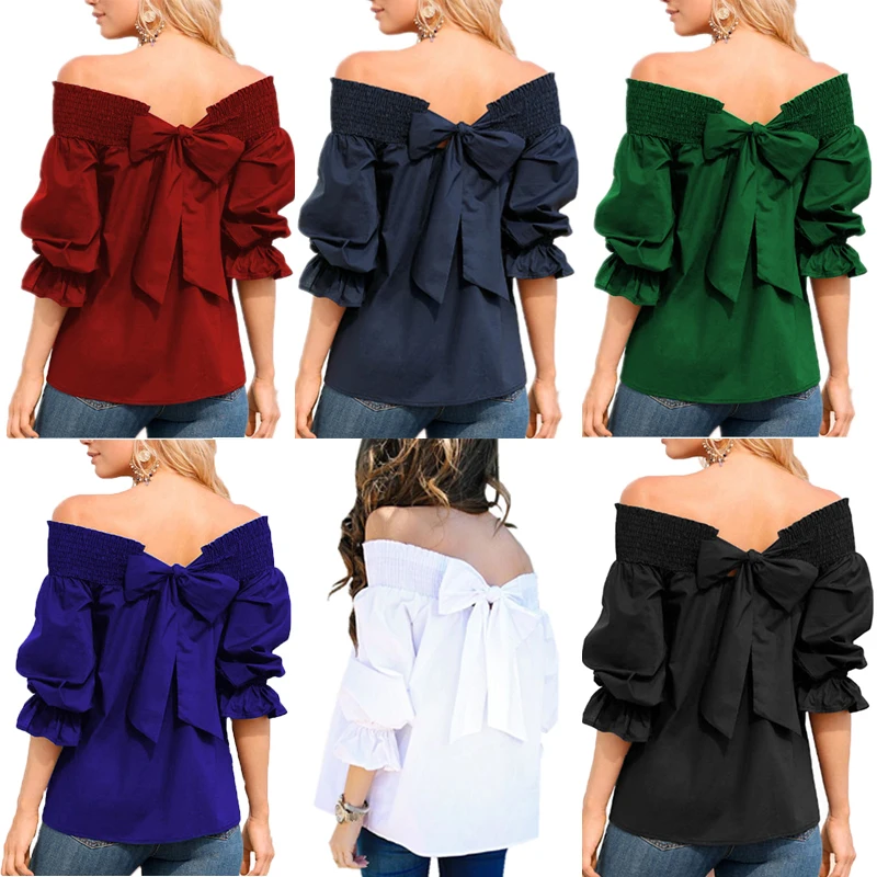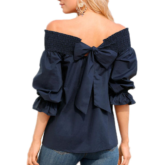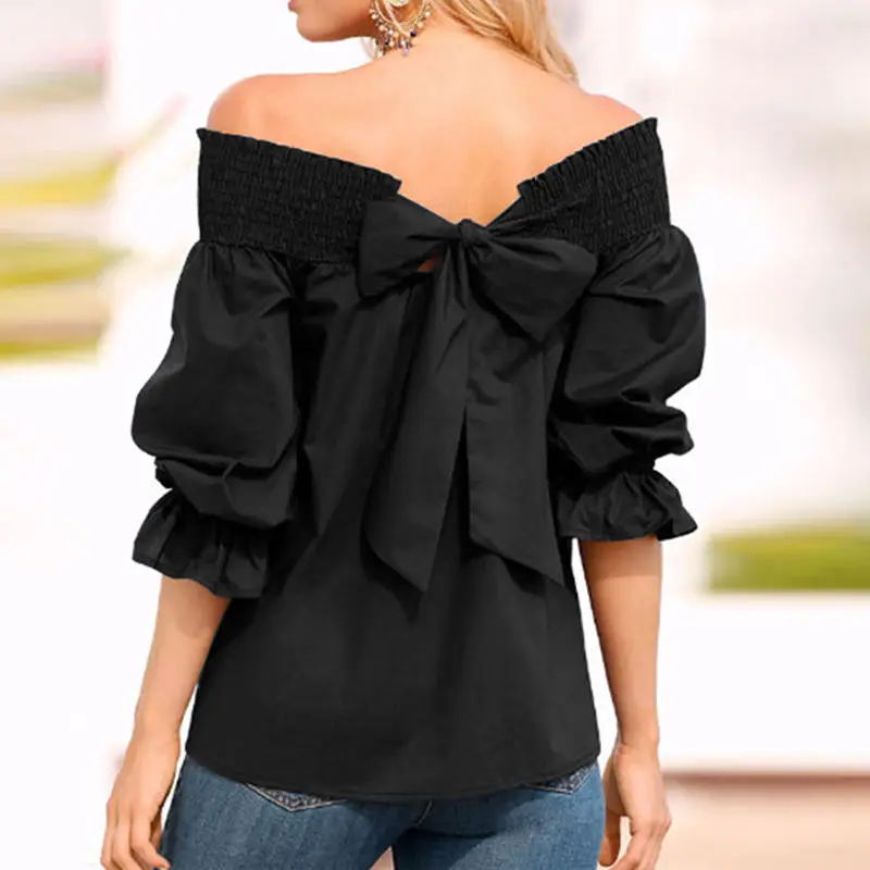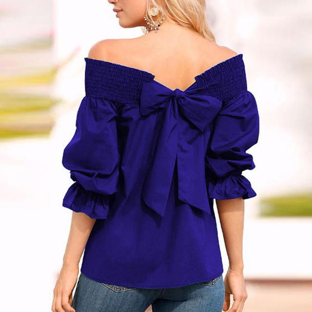 Product Description: Womens Off Shoulder 3/4 Sleeve Ruffle Cuffs Back Bowknot Tie Casual Tops