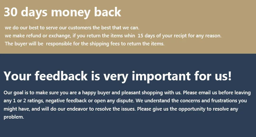 • If you did not receive the product within the guaranteed time( 45 days not including 2-5 day processing) you can request a refund or a reshipment.