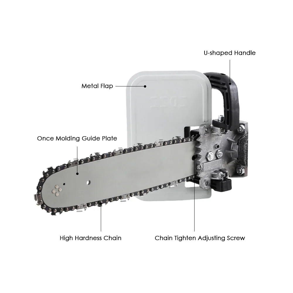 The electric chain saw converter is suitable for 4 Inch(100mm) electric angle grinder with M10 thread spindle. When you want to tighten the chain or loosen the chain, first you need to loose the hex screws on the black board, then you can loose or tighten the screw with the screwdriver, when you feel the chain is suitable for your work, you can fix the hex screw again and use the chain saw.