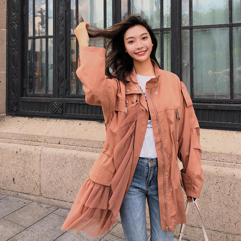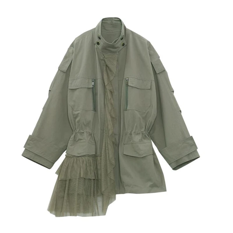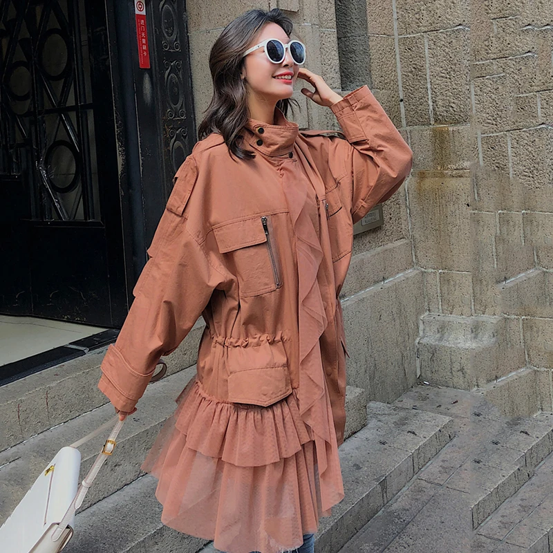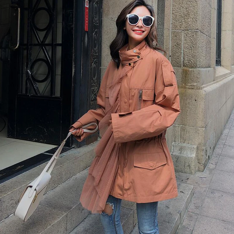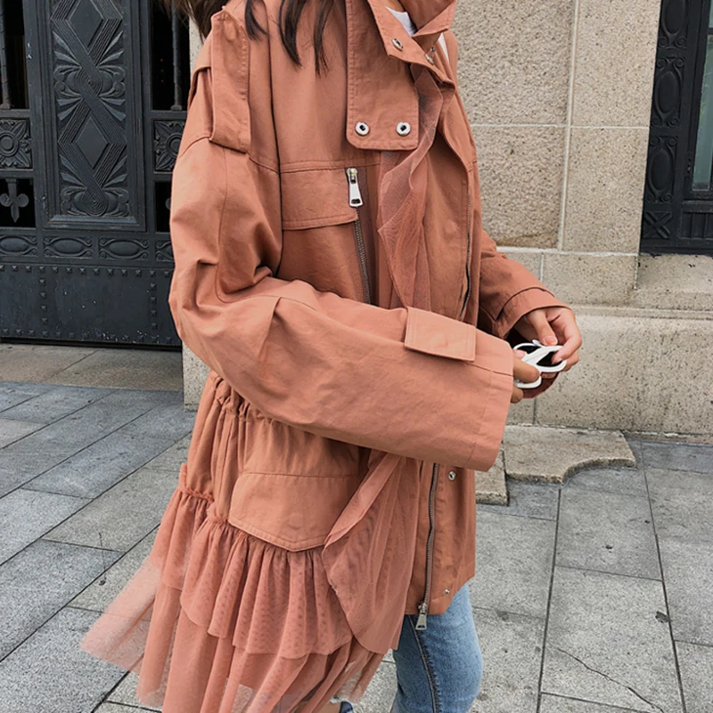 CHICEVER Patchwork Mesh Trench Coat For Women’s Windbreaker Stand Collar Long Sleeve Zipper Trench Female Autumn Fashion Tide