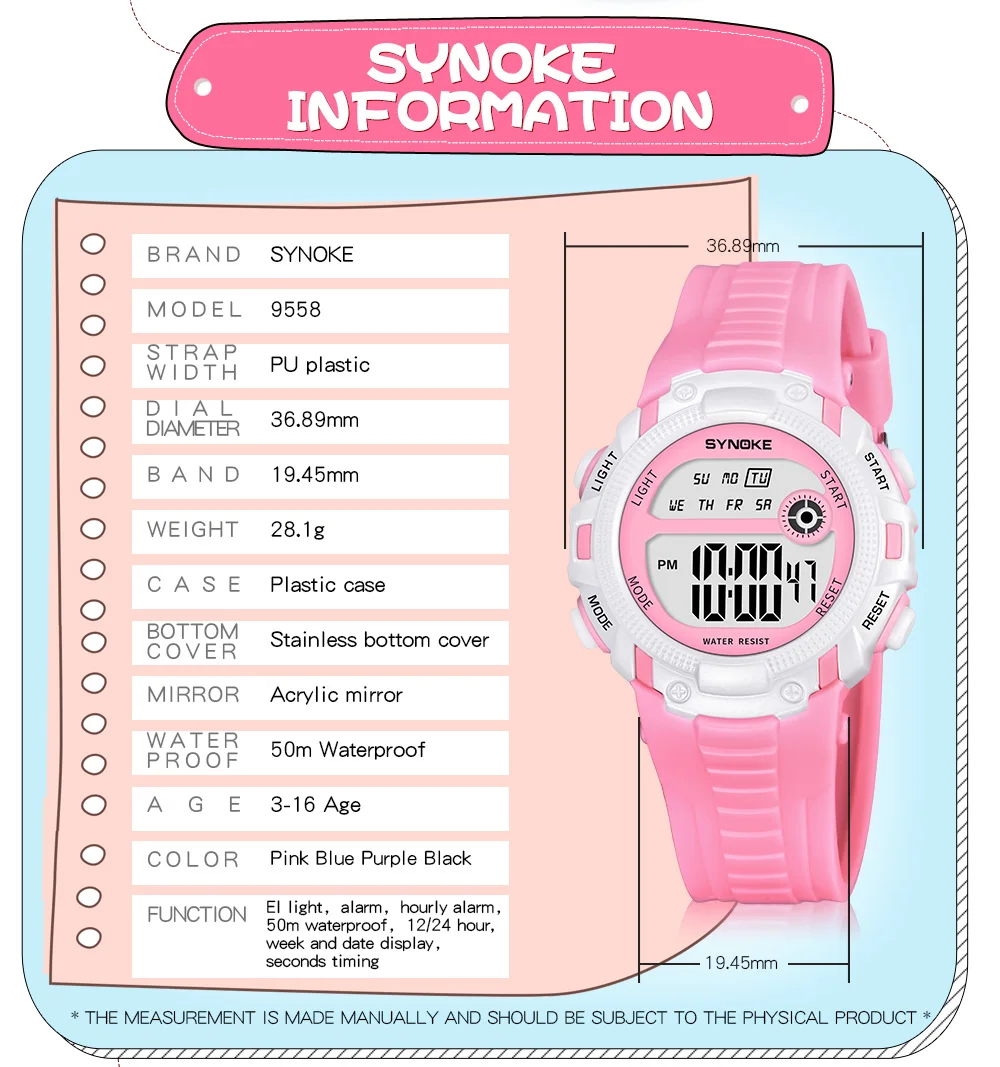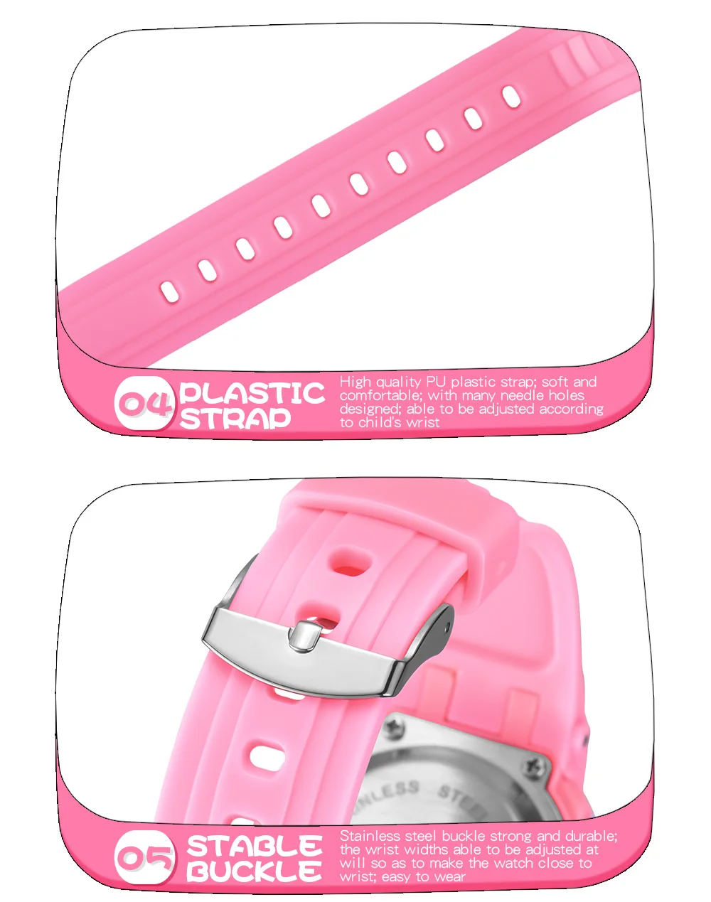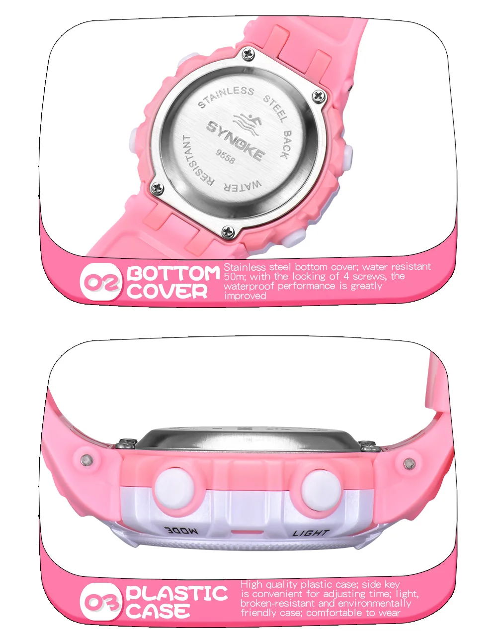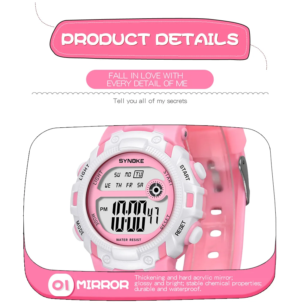 Quality ABS plastic case, high-PU plastic strap, thickened acrylic resin hardening mirror, the bottom cover stainless steel, stainless steel clasp