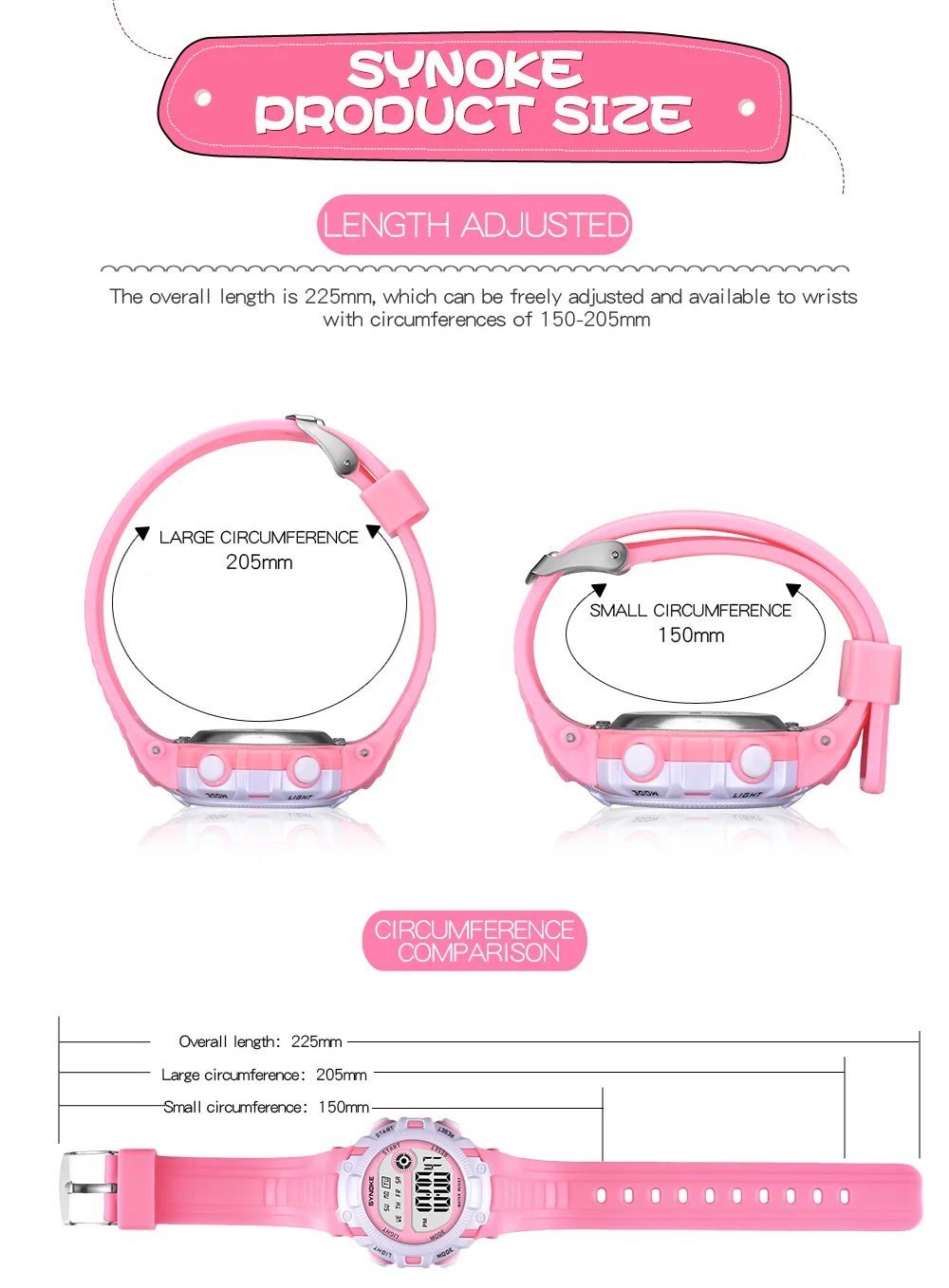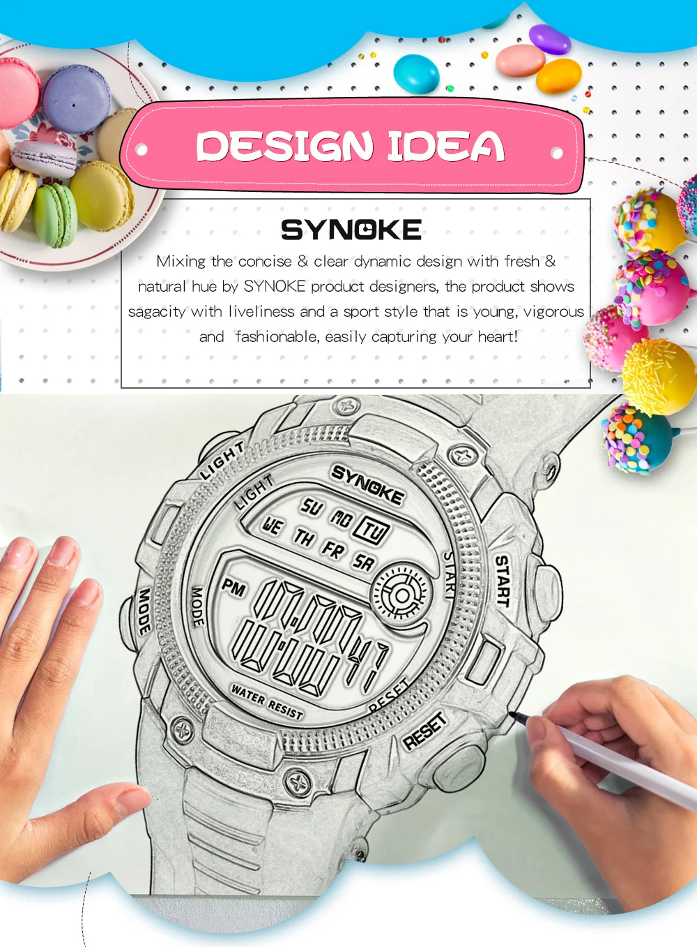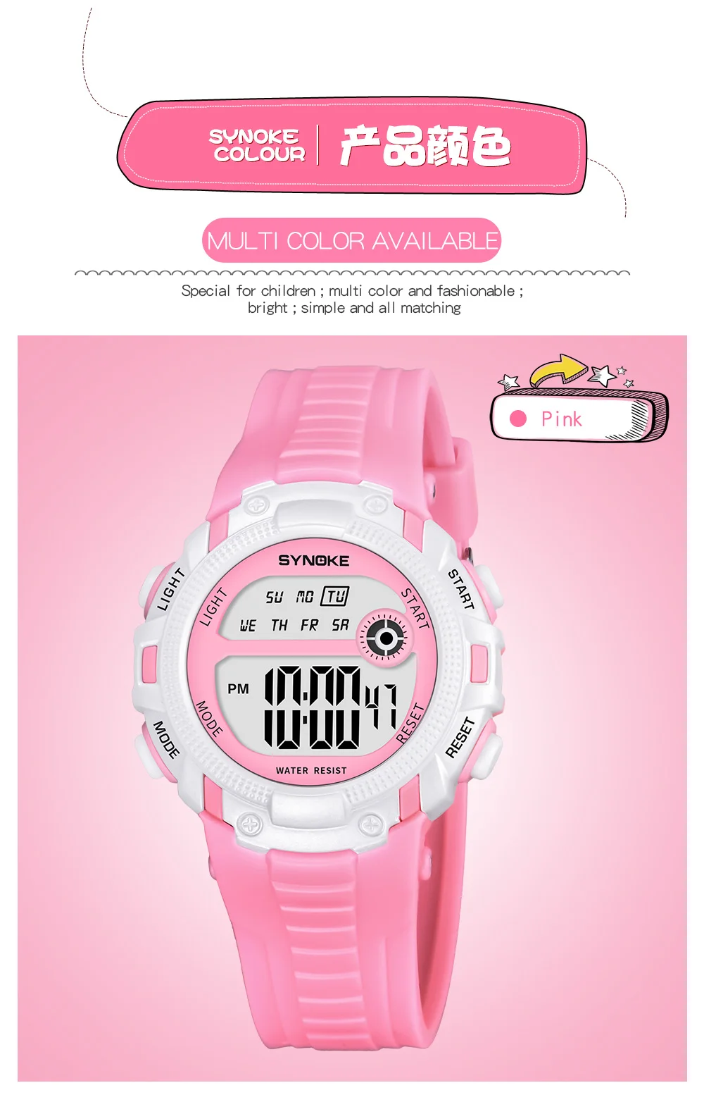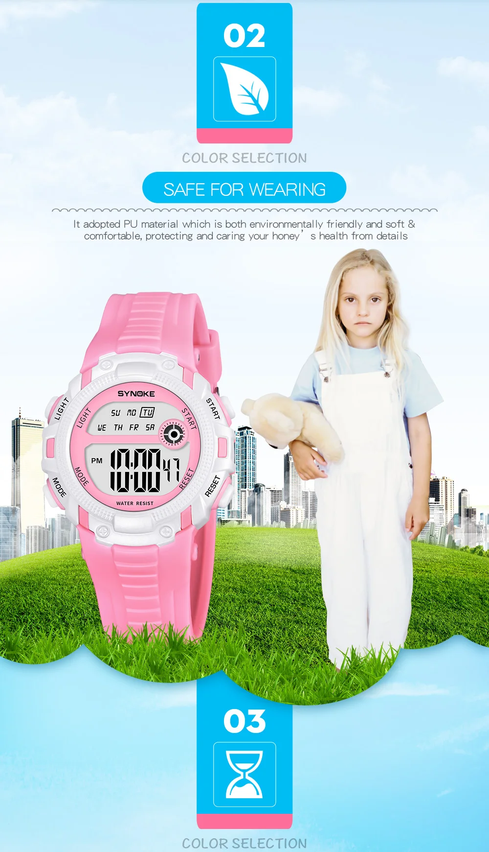 Quality ABS plastic case, high-PU plastic strap, thickened acrylic resin hardening mirror, the bottom cover stainless steel, stainless steel clasp