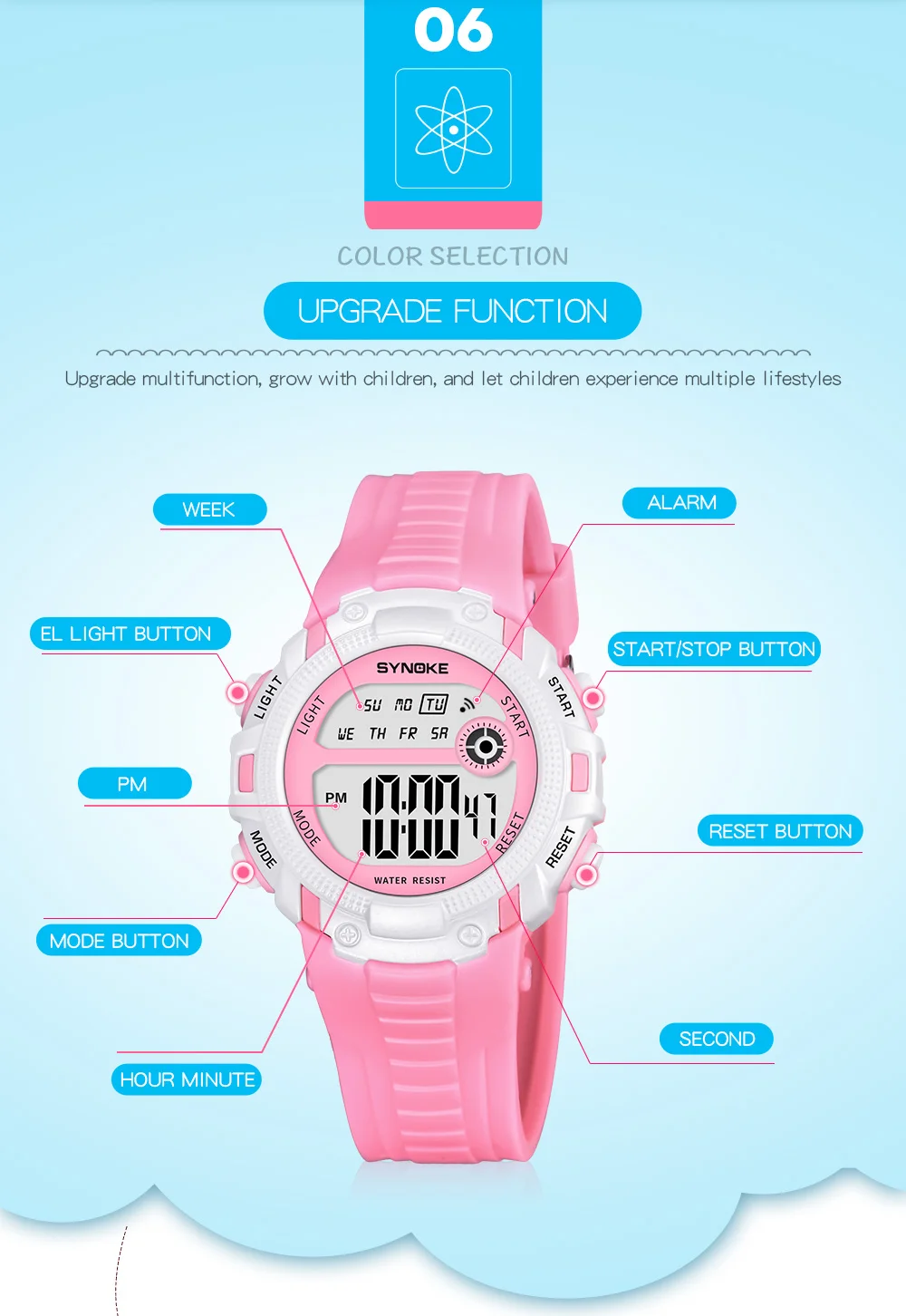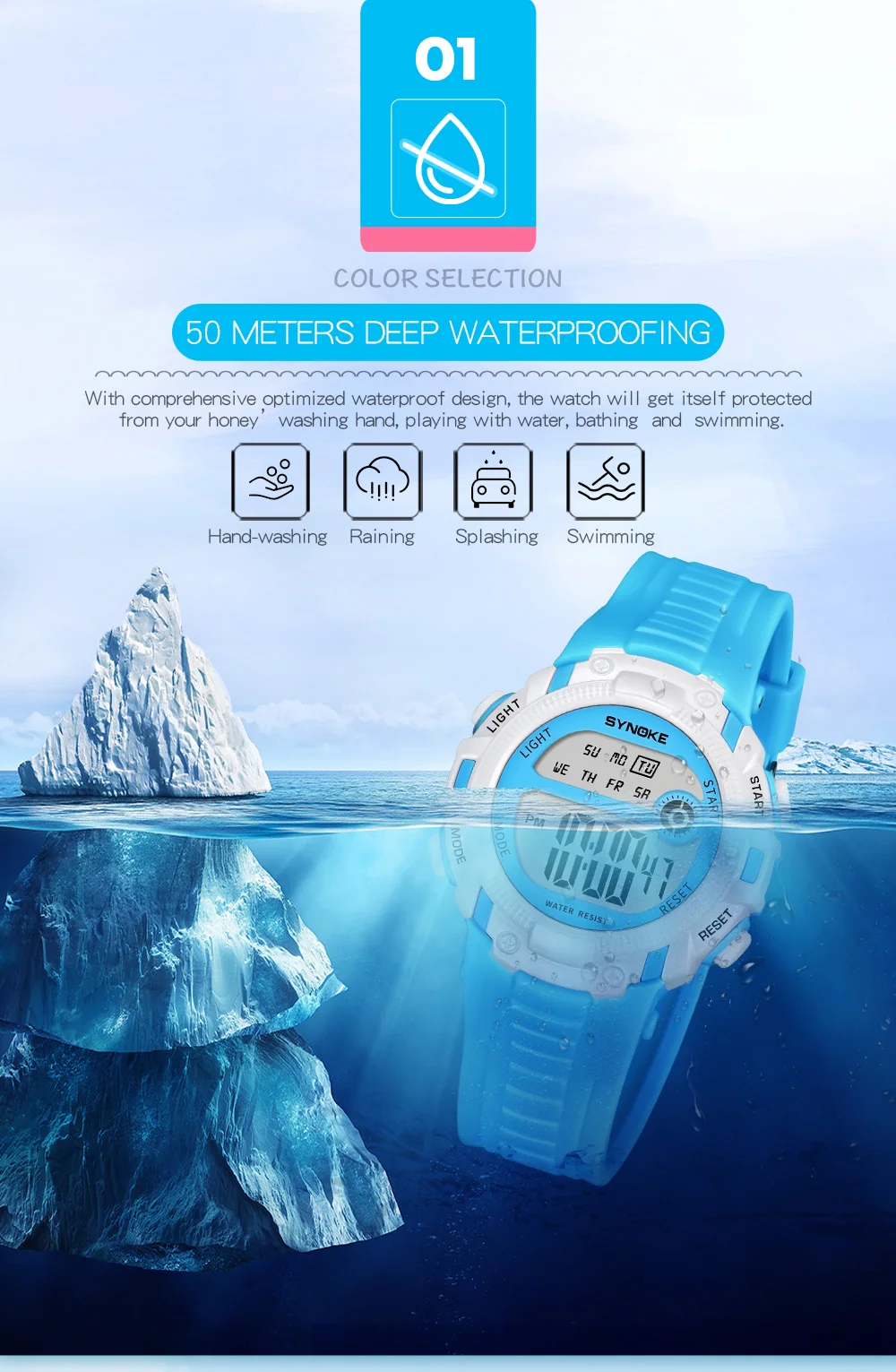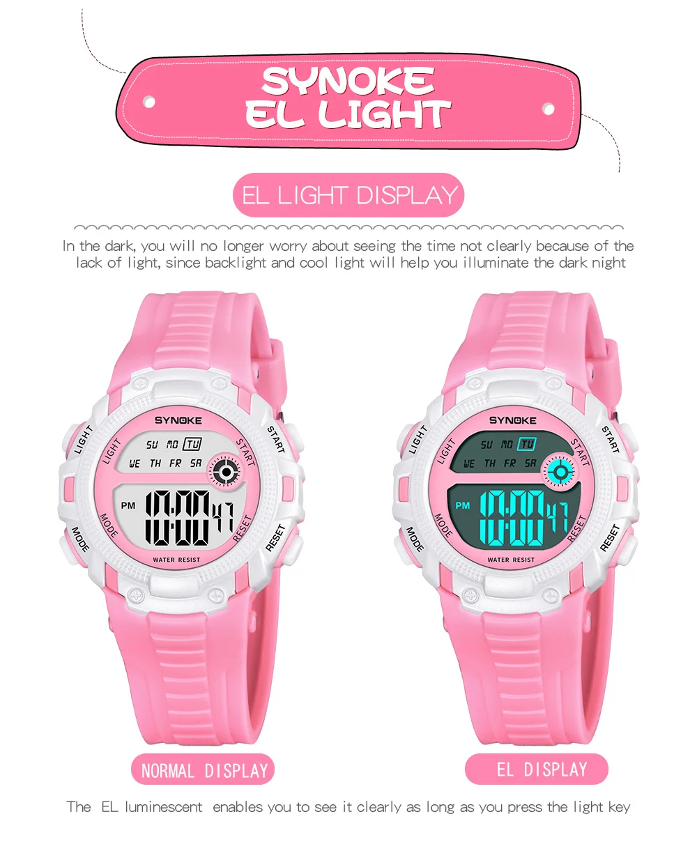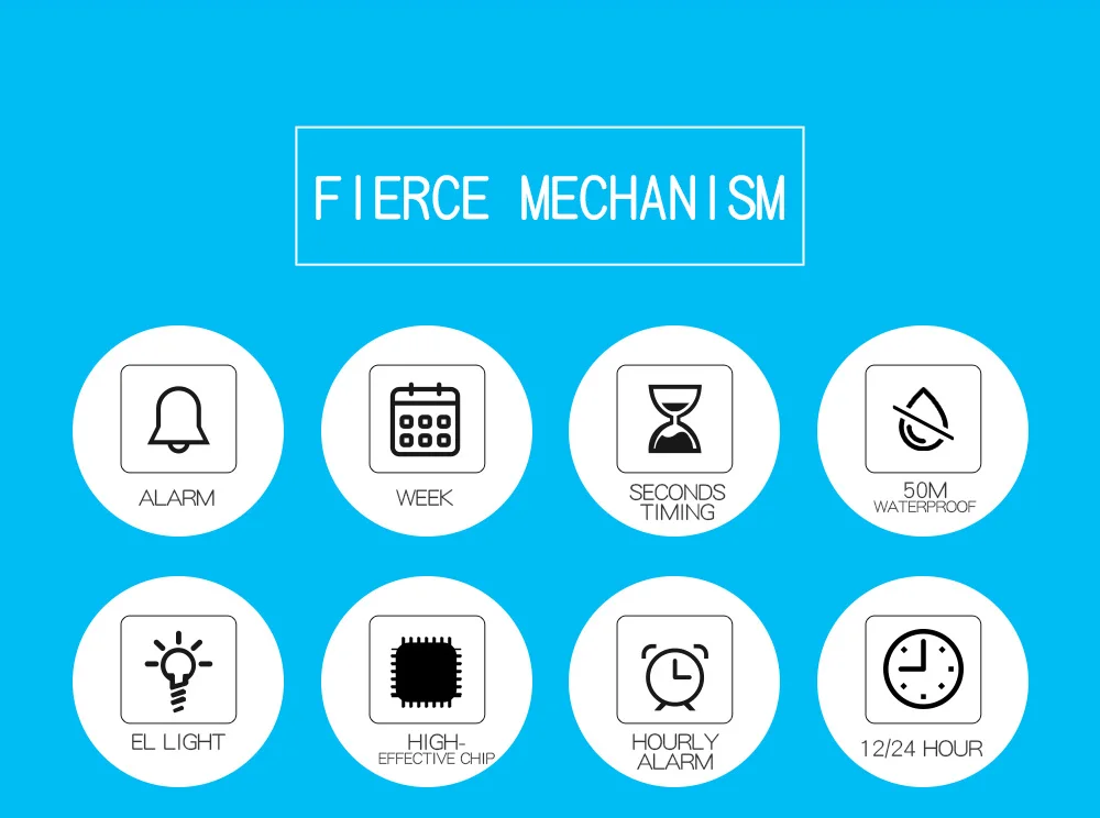 LED, luminous, alarm, 50m swimming waterproof, whole hour, time second, Sunday display, 12/24 hour