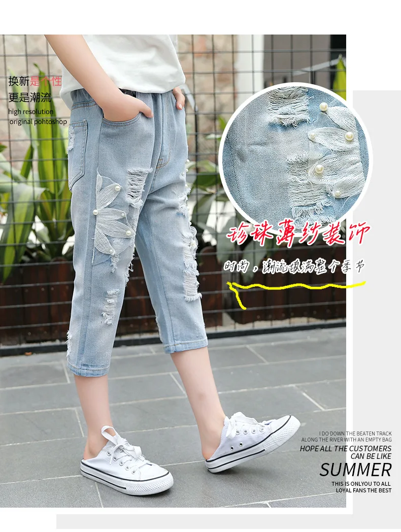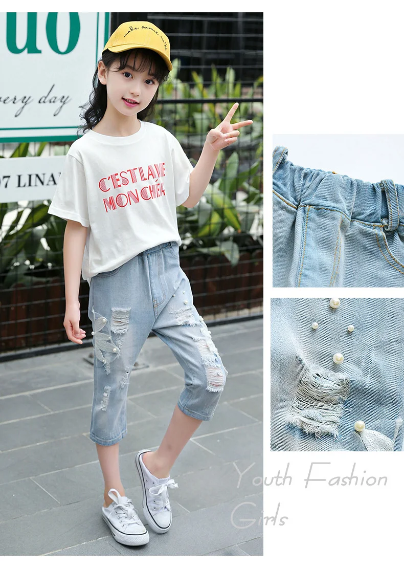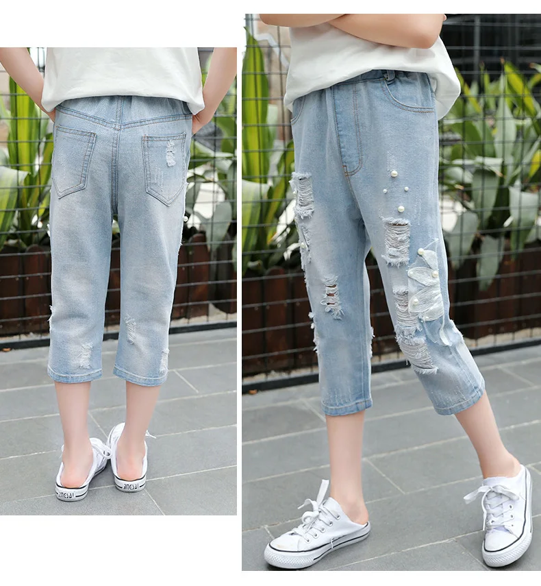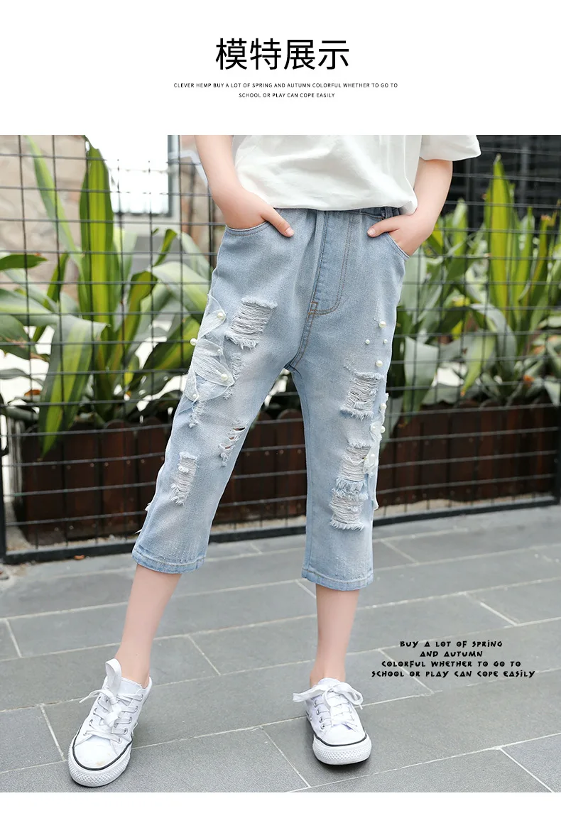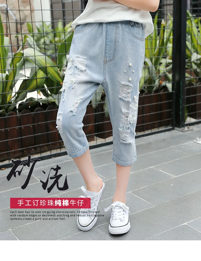 Children Summer Hot Shorts For Big Girls Hole Clothes New Elastic Wash Pearl Denim Pants Baby Kids Cotton Leggings 6 To 14 Years