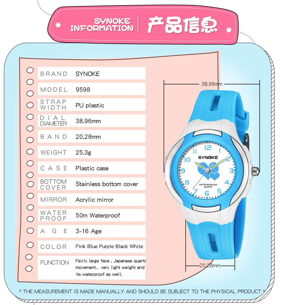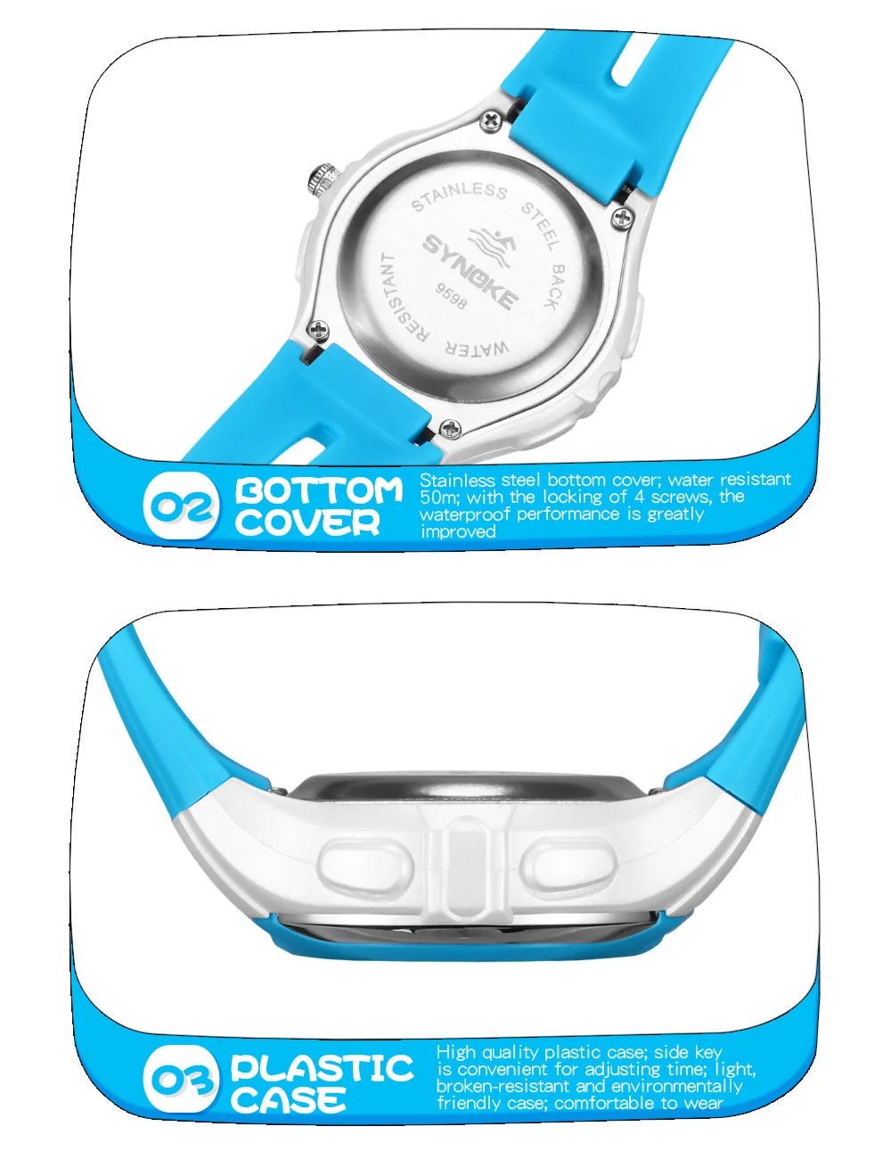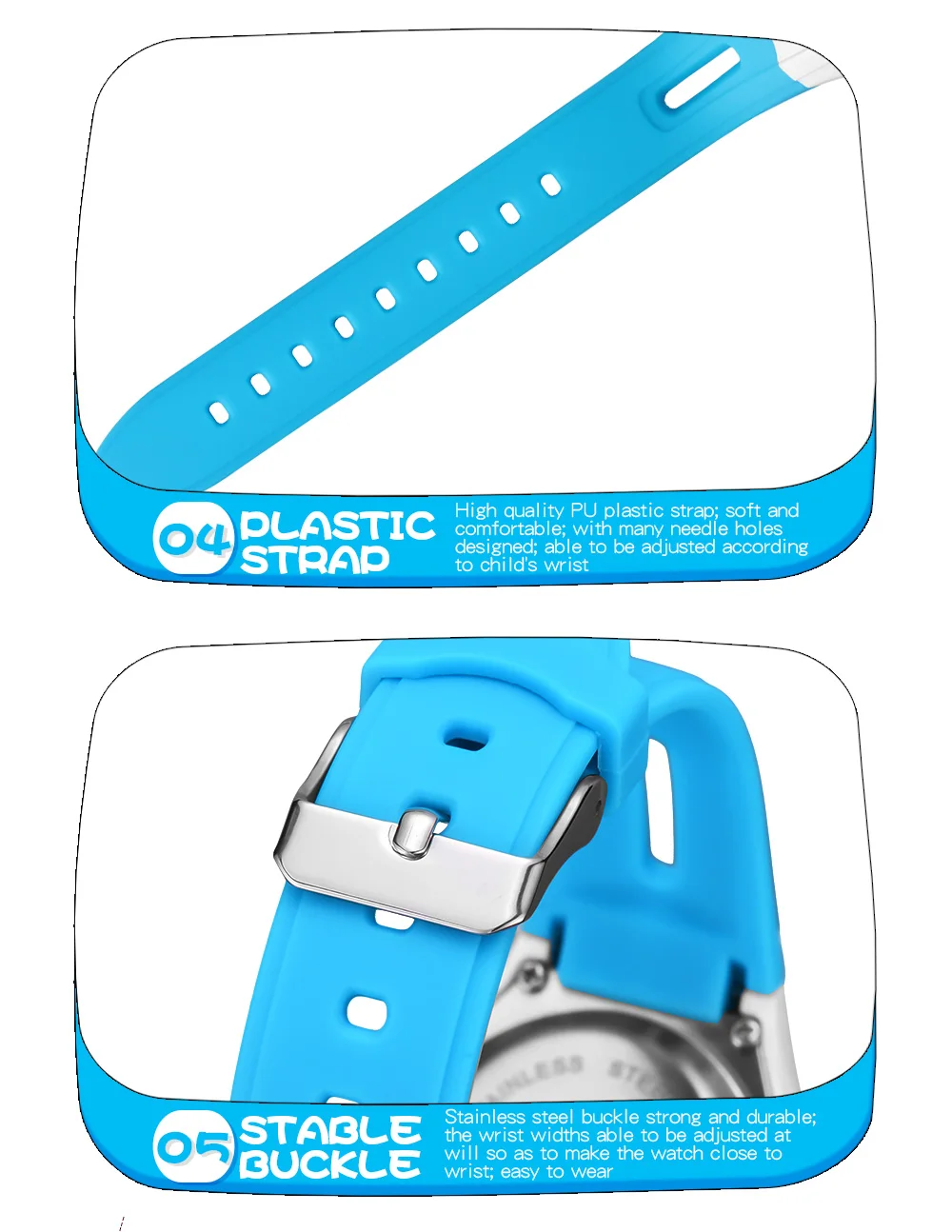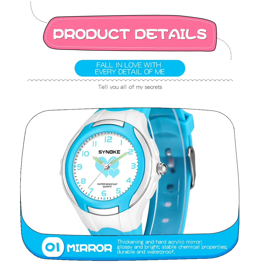 Quality ABS plastic case, high-PU plastic strap, thickened acrylic resin hardening mirror, the bottom cover stainless steel, stainless steel clasp
