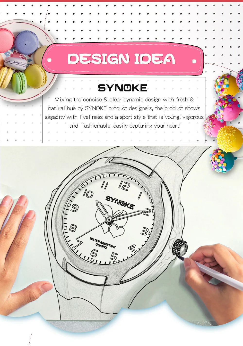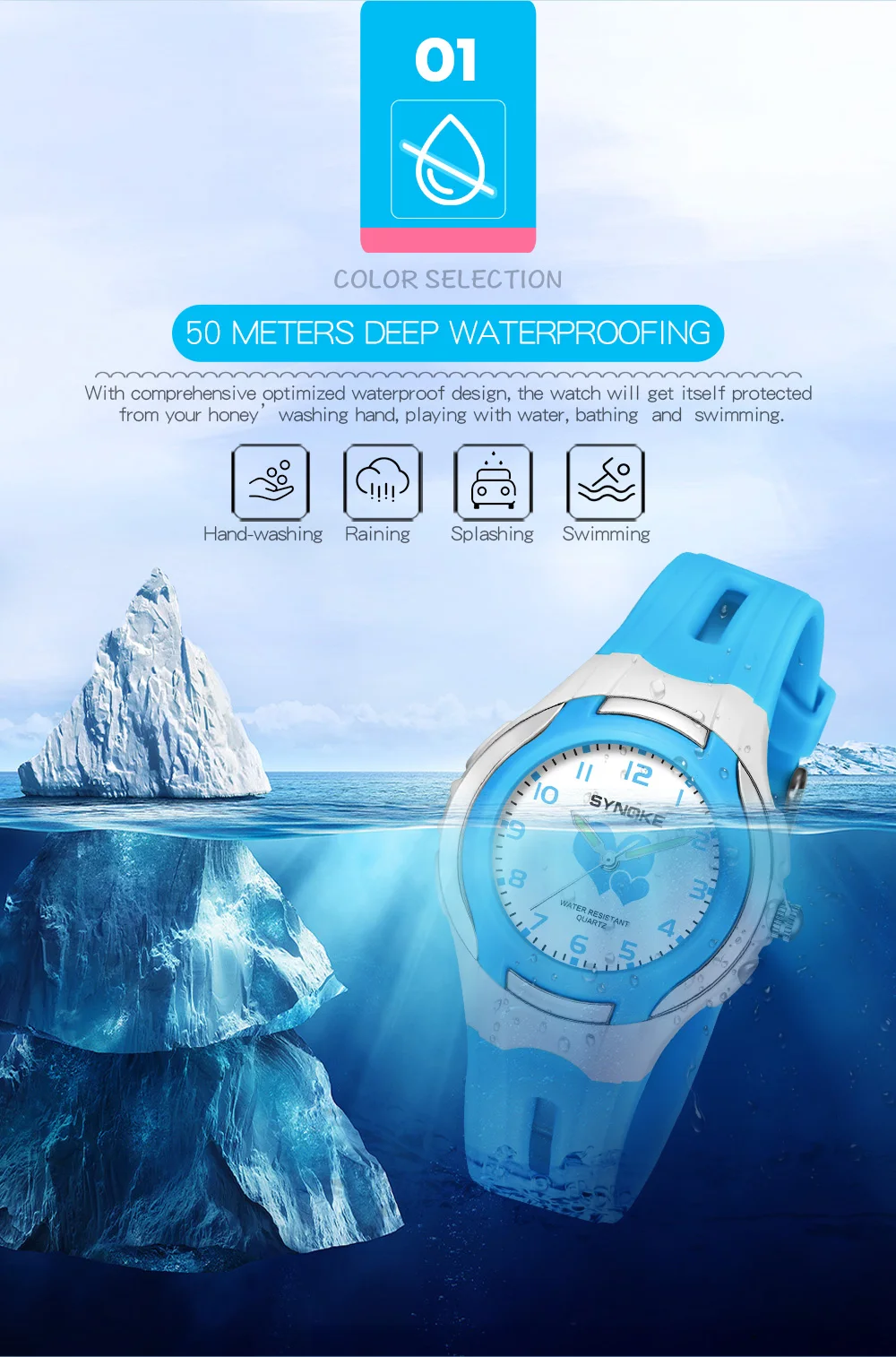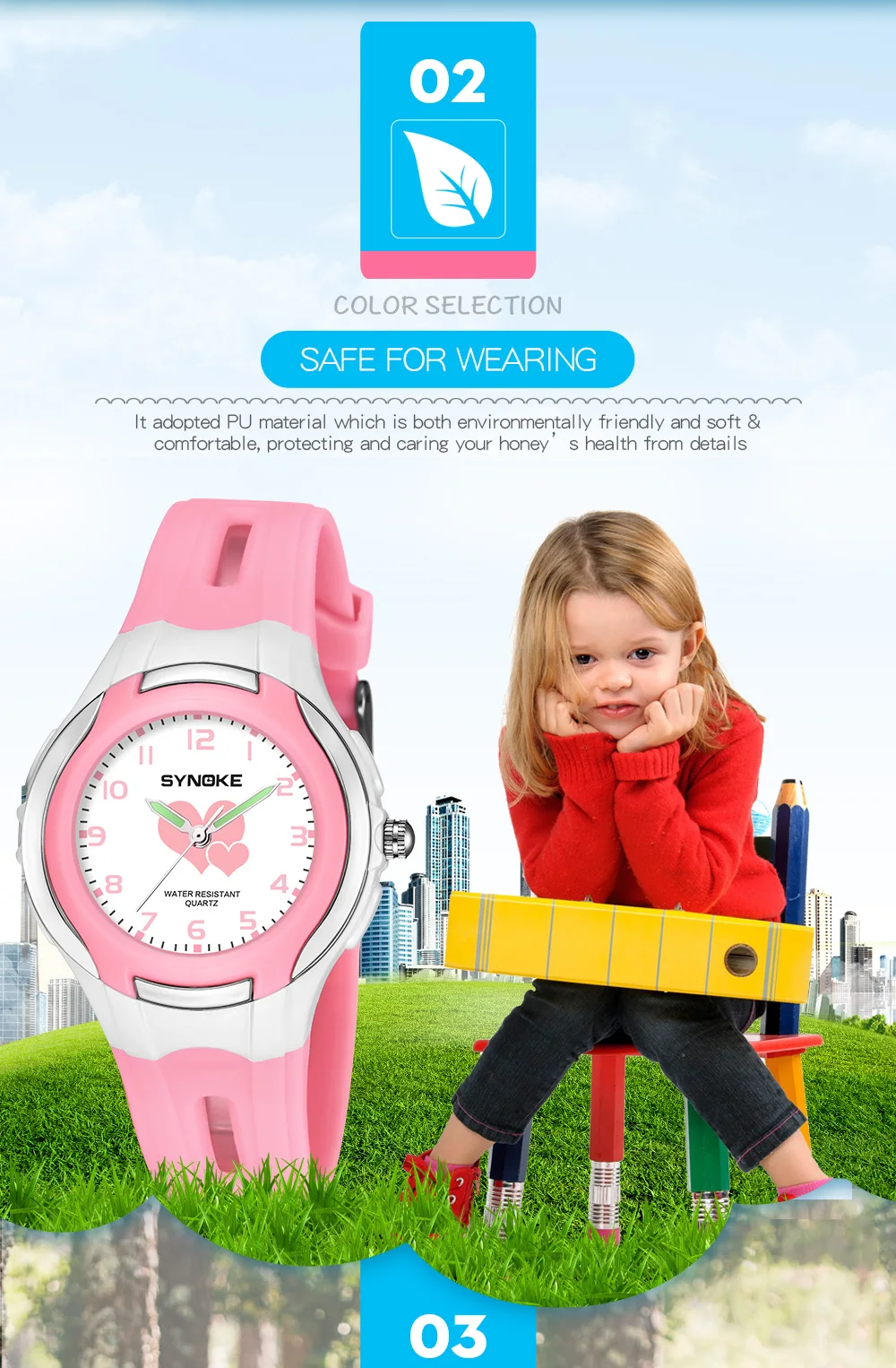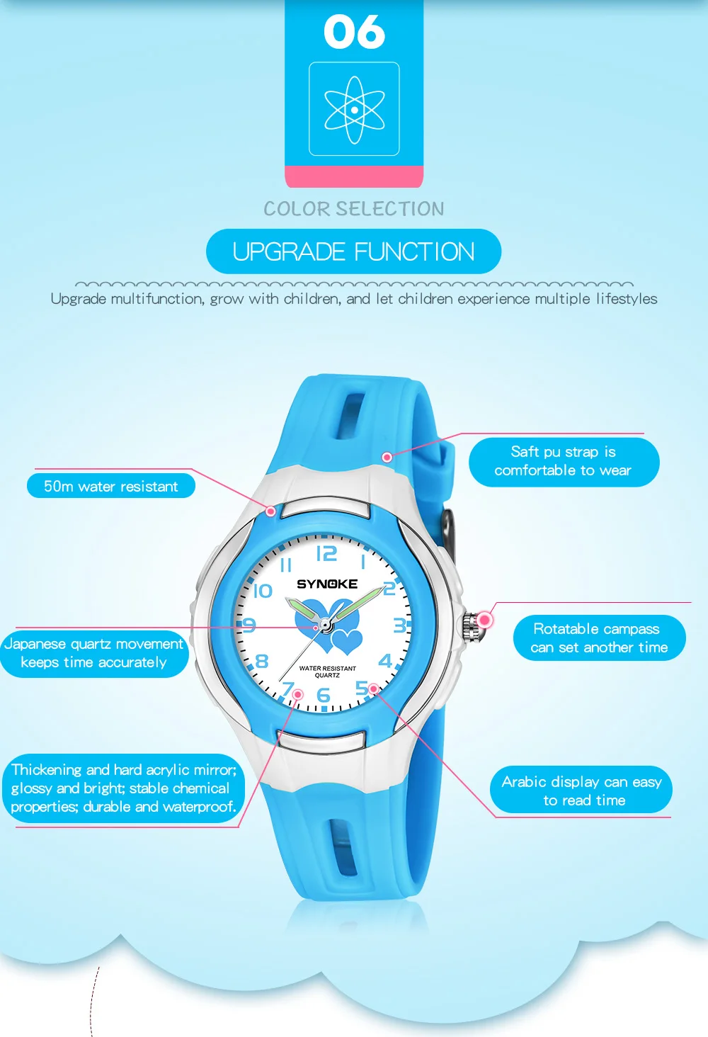 Quality ABS plastic case, high-PU plastic strap, thickened acrylic resin hardening mirror, the bottom cover stainless steel, stainless steel clasp