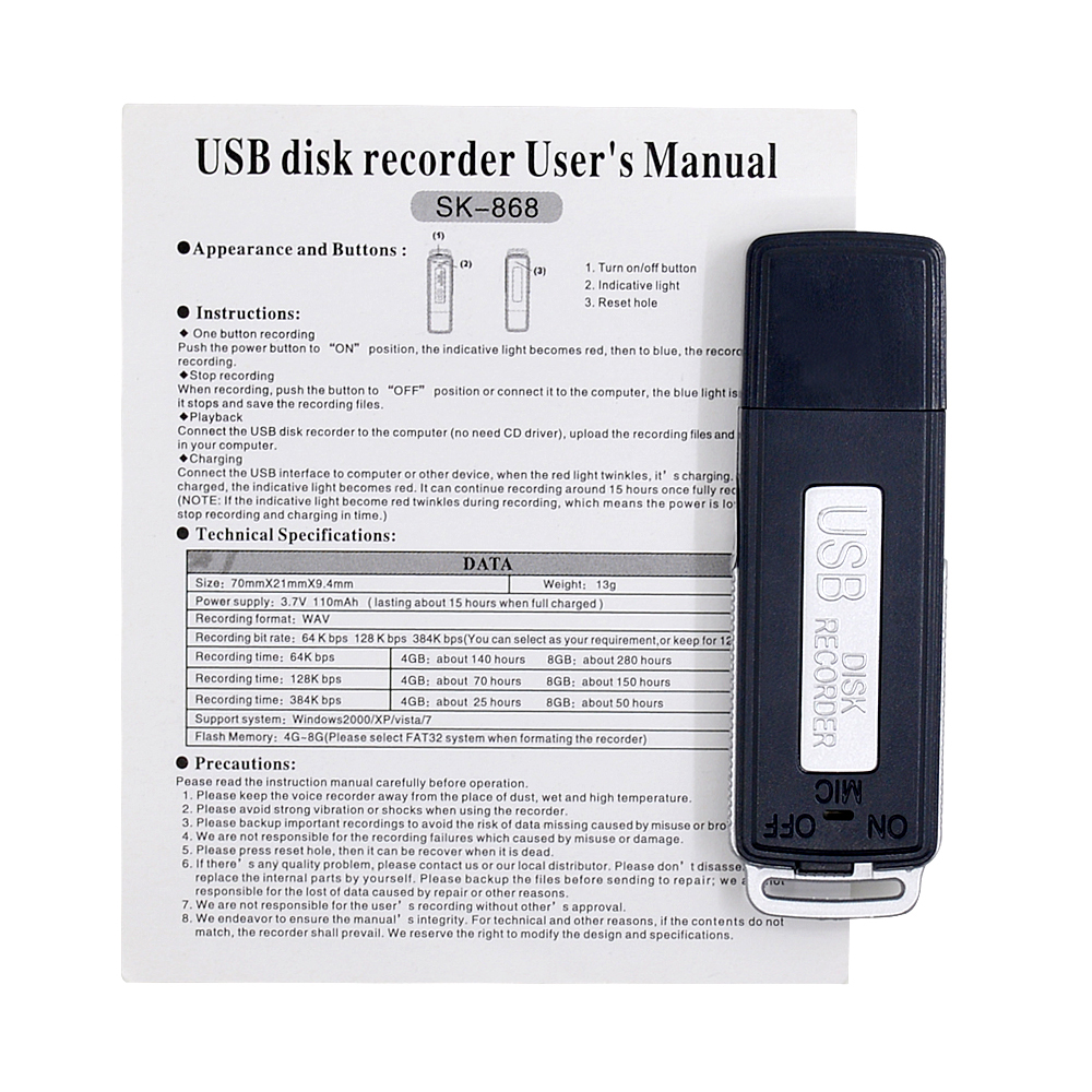 Flash Memory :8GB (Please select FAT32 system when formatting the recorder)