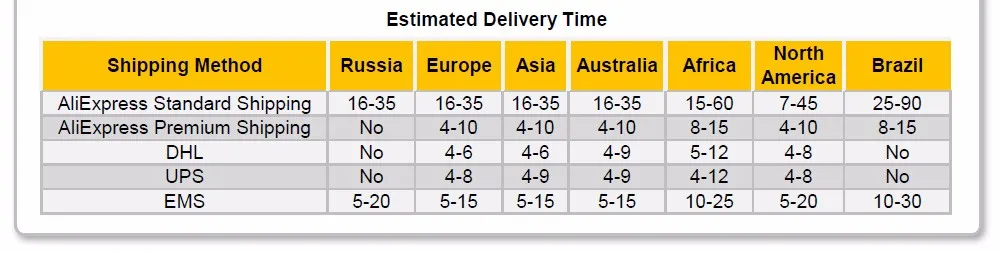 Packages from our warehouse in China will be shipped by ePacket or EMS depending on the weight and size of the product. Packages shipped from our US warehouse are shipped through USPS.