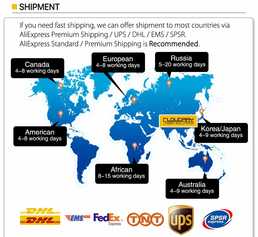 1. All the products shipping from China might cause tariffs. Please know well about your country’s import laws. All the products Cloudray selling default FOB trading terms, the buyers will take his responsibility on all kinds of tax in their country. If you have special requests about declaration, please leave messages to us when you make an order.