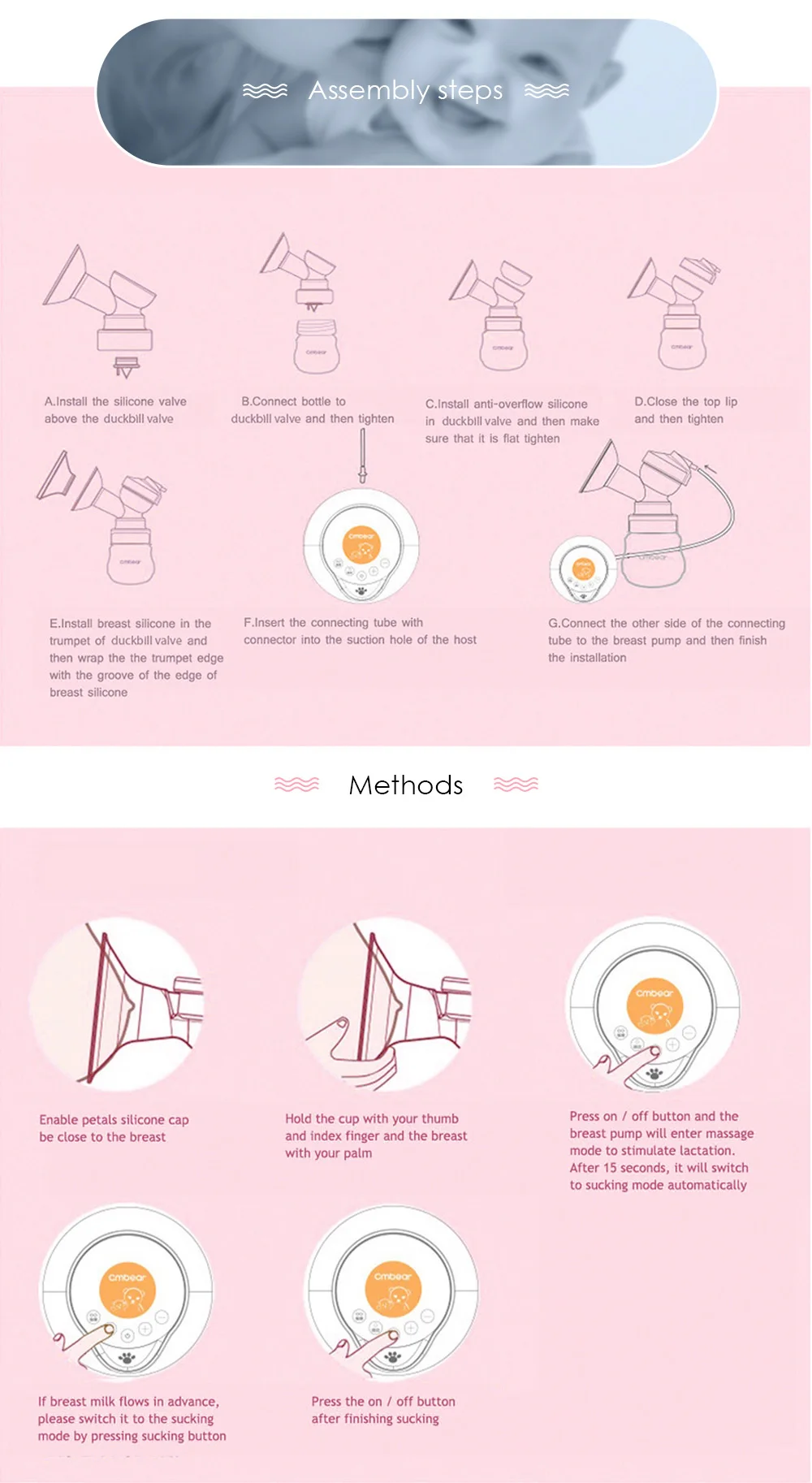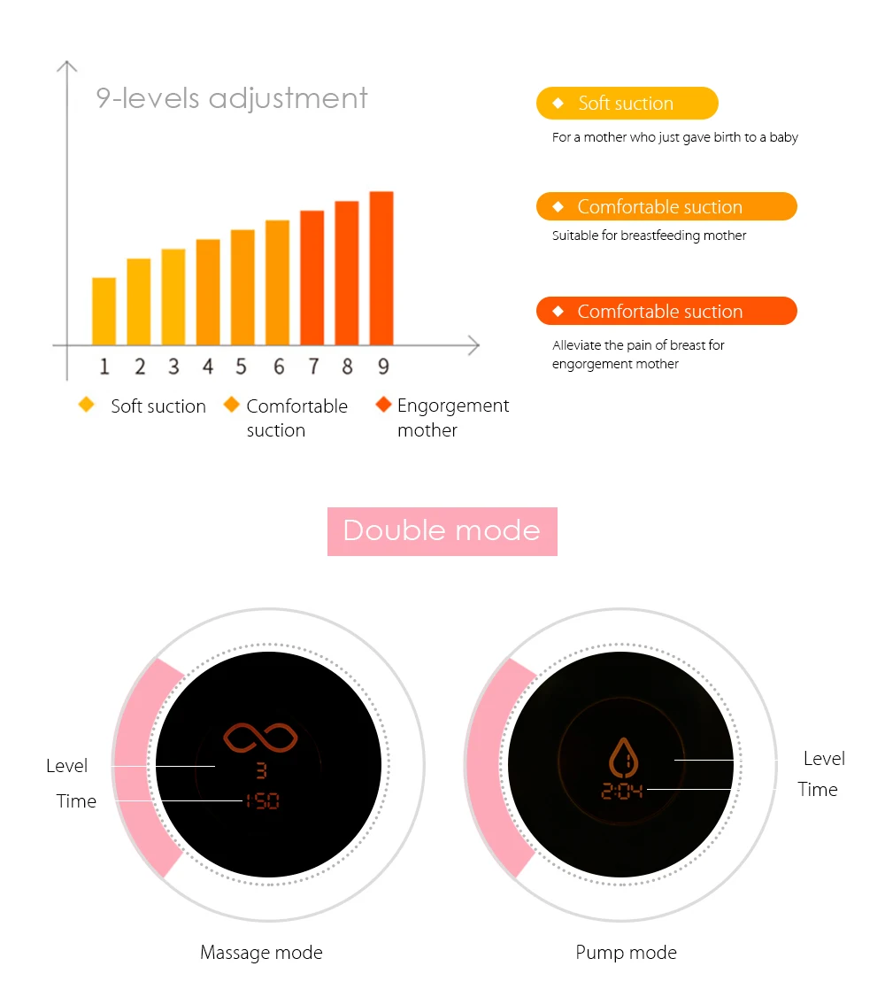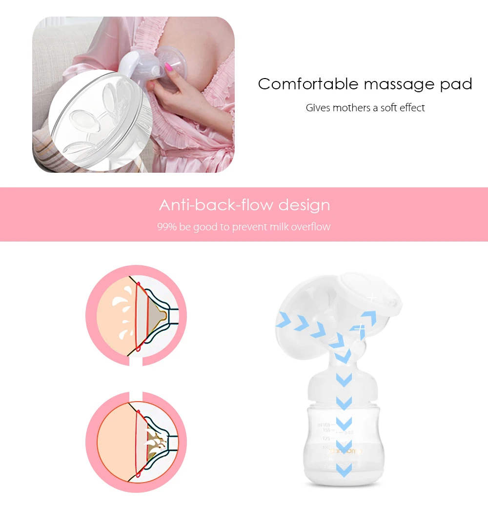 Don’t worry! Our electric breast pump, mummy’s good helper, with anti-back-flow design and wide mouth bottle makes it convenient to milk storage, help the feeding and prevent breast milk spilled.