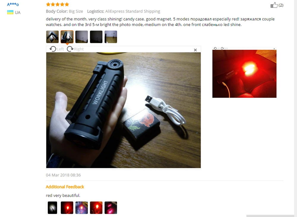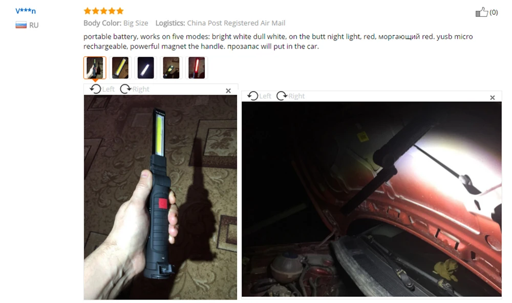 5 Modes: High COB LED,Low COB LED,LED,Red light(long press),