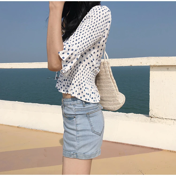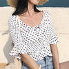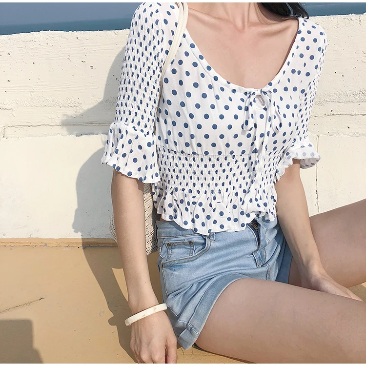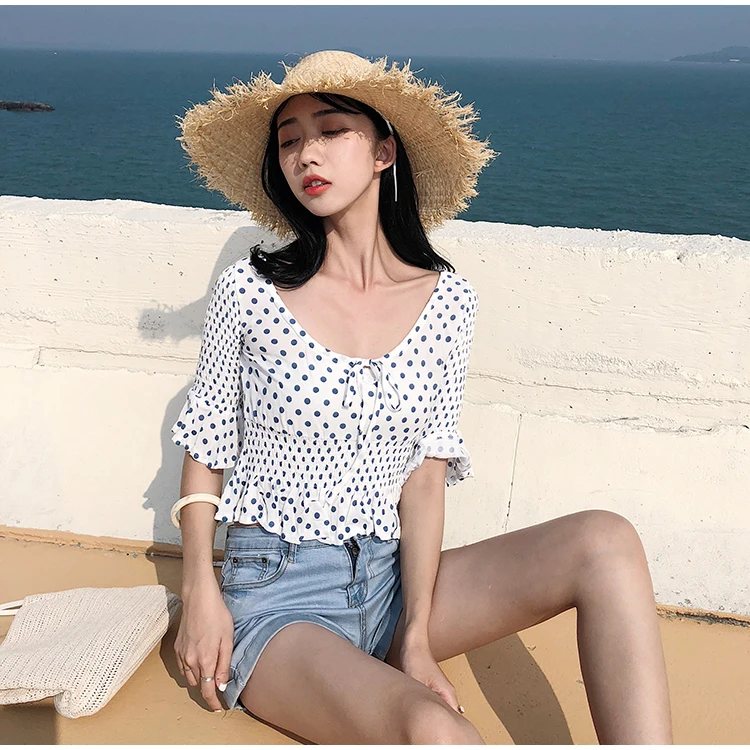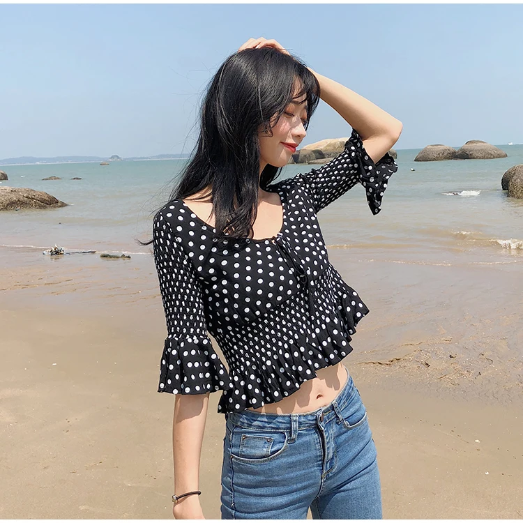 Colorfaith Women Blouses 2018 Spring Summer Ruffles Sexy Dots Printed Flare Sleeve Ladies Retro Fashion Tops Beach shirt BL3150
