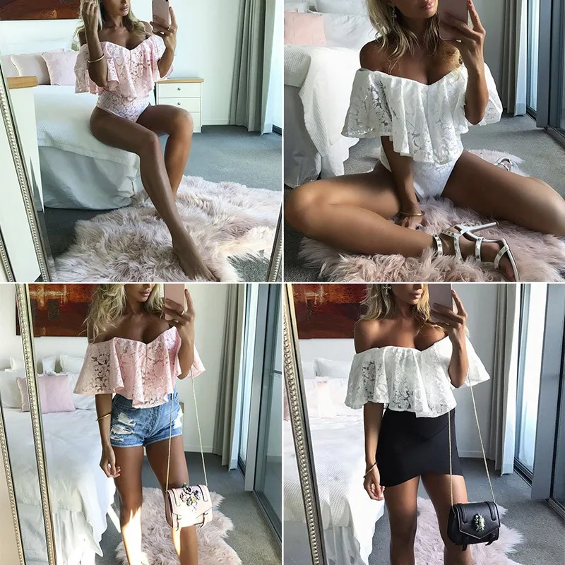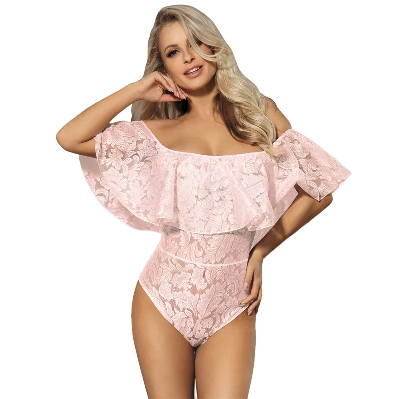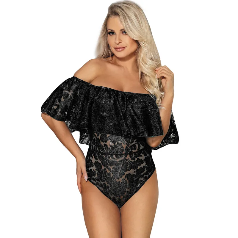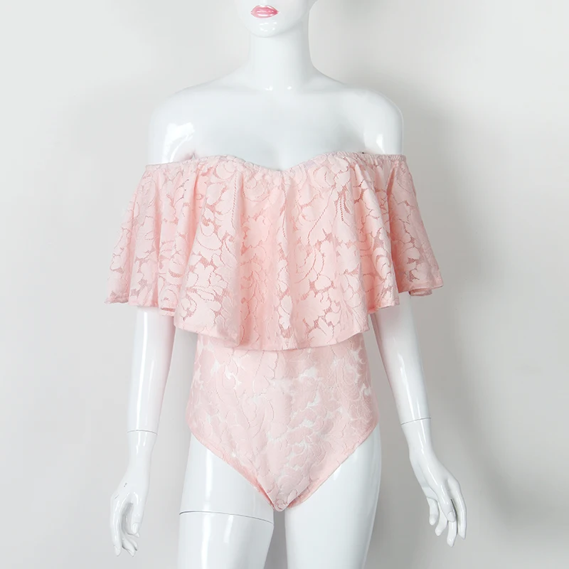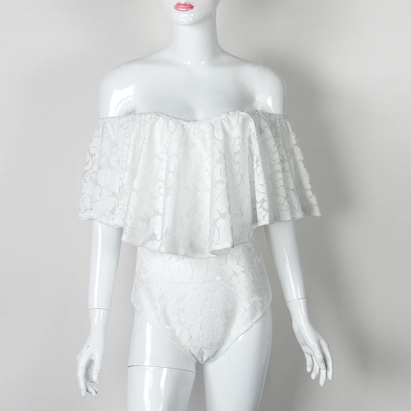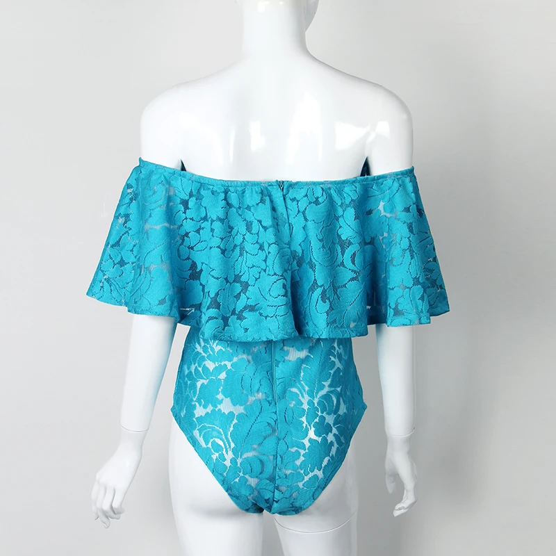 Comeondear Lace Ruffle Off The Shoulder Bodysuit RK80496 Large Size Sexy Floral Lace Bodysuit Women Rompers Overalls Playsuit