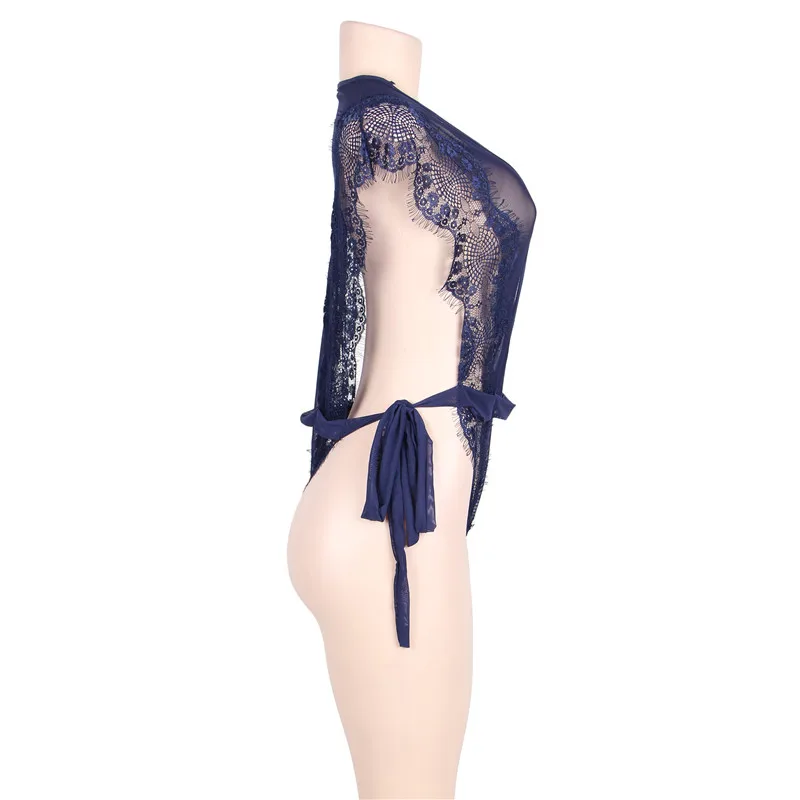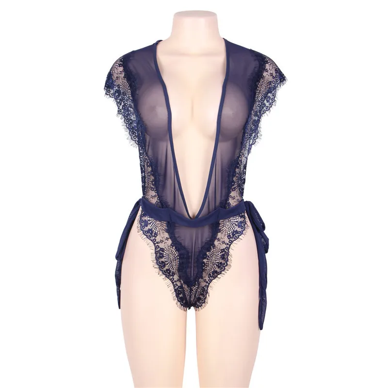 Comeondear Pagliaccetti Donna Navy Blue Ribbon Sash Eyelash Chiffon Bodysuit V-neck Sexy Women Jumpsuit 2018 Body Top RJ80410 Detail Show :
