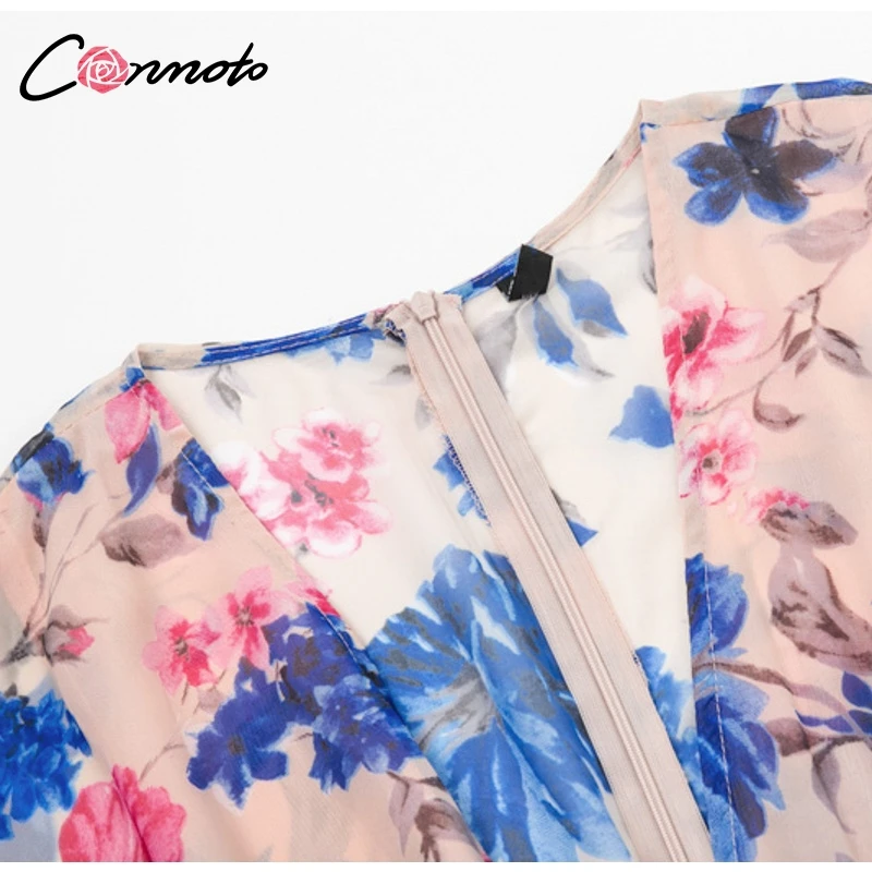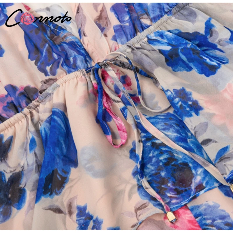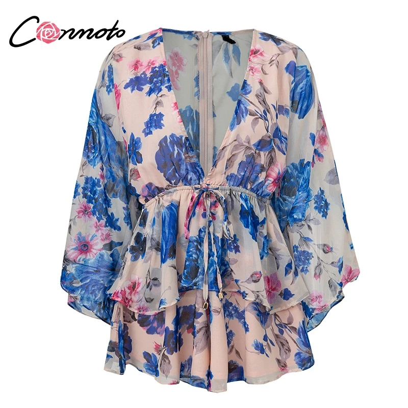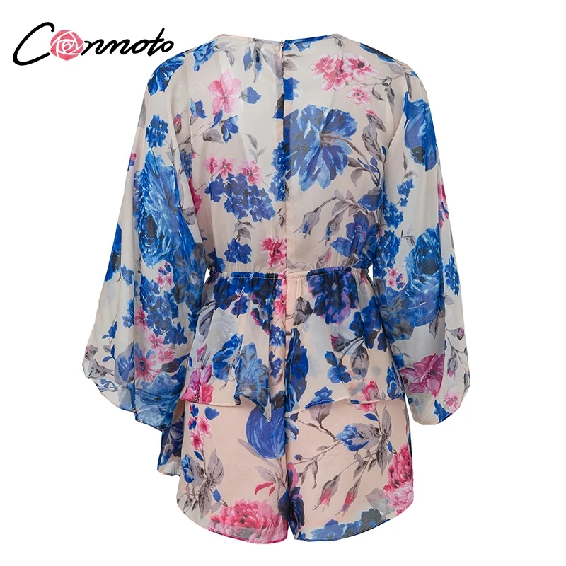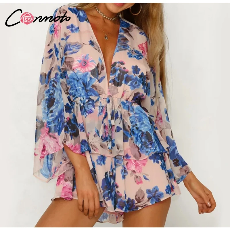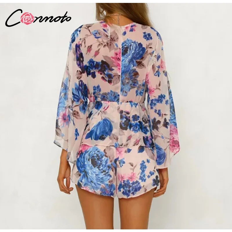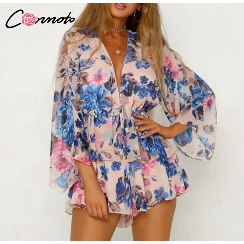 Conmoto Butterfly Sleeve Women Casual Playsuit Sexy Chiffon Bohemian Beach Playsuit Deep V Neck Ruffle Floral Romper Jumpsuit