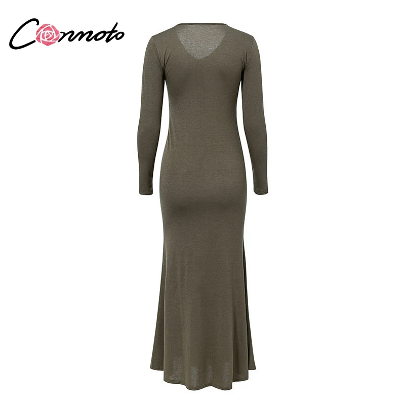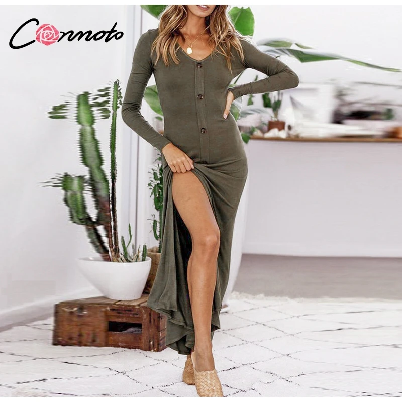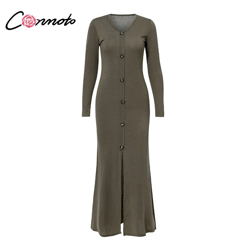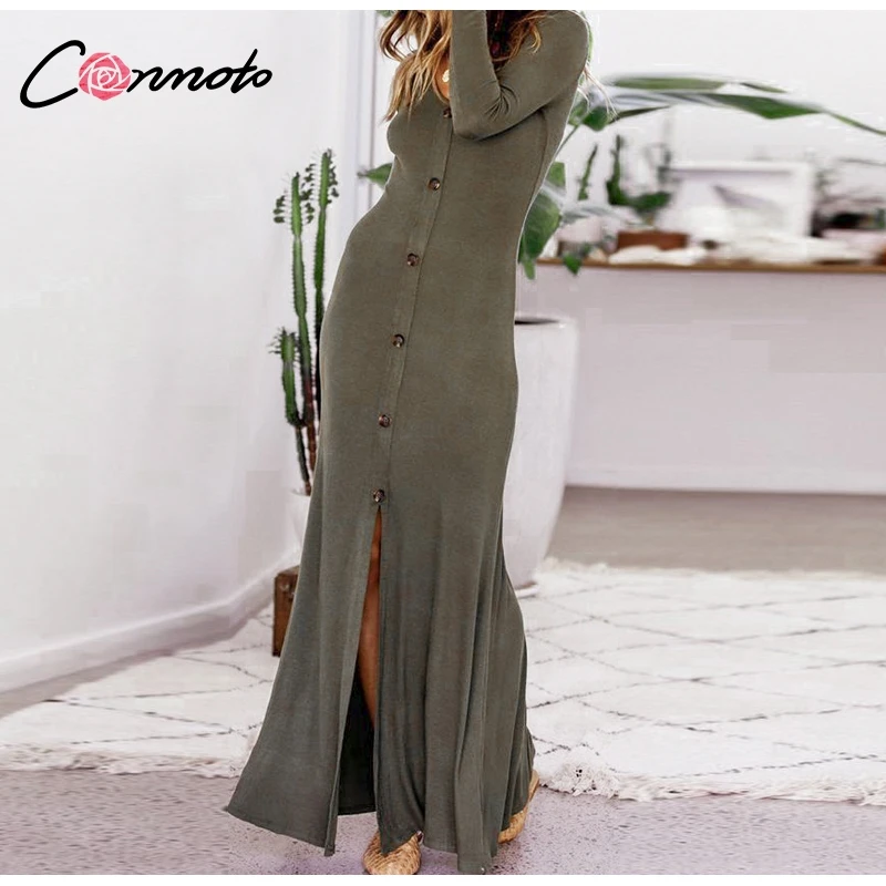 Conmoto Casual Button up Cotton Long Dress 2018 Fall Winter Long Sleeve Elegant Maxi Dress Army T Shirt Split Dress
