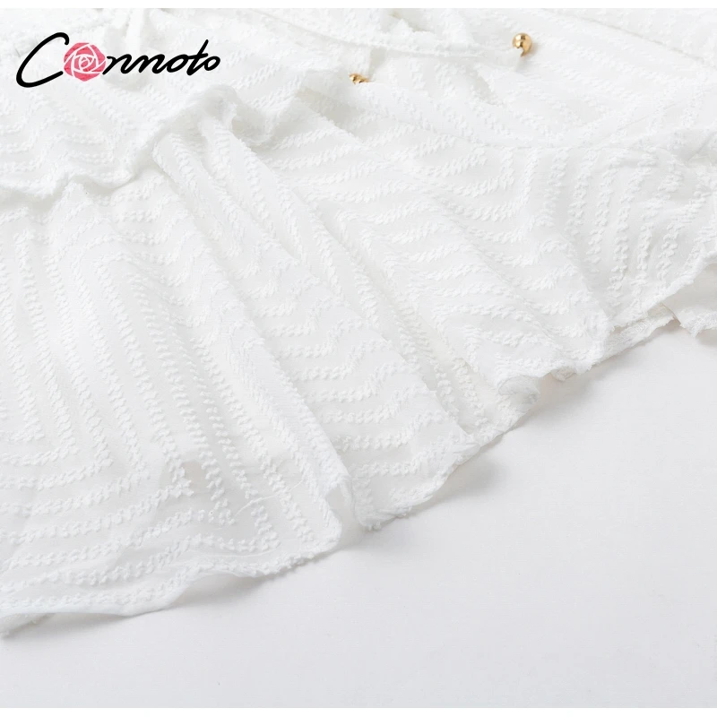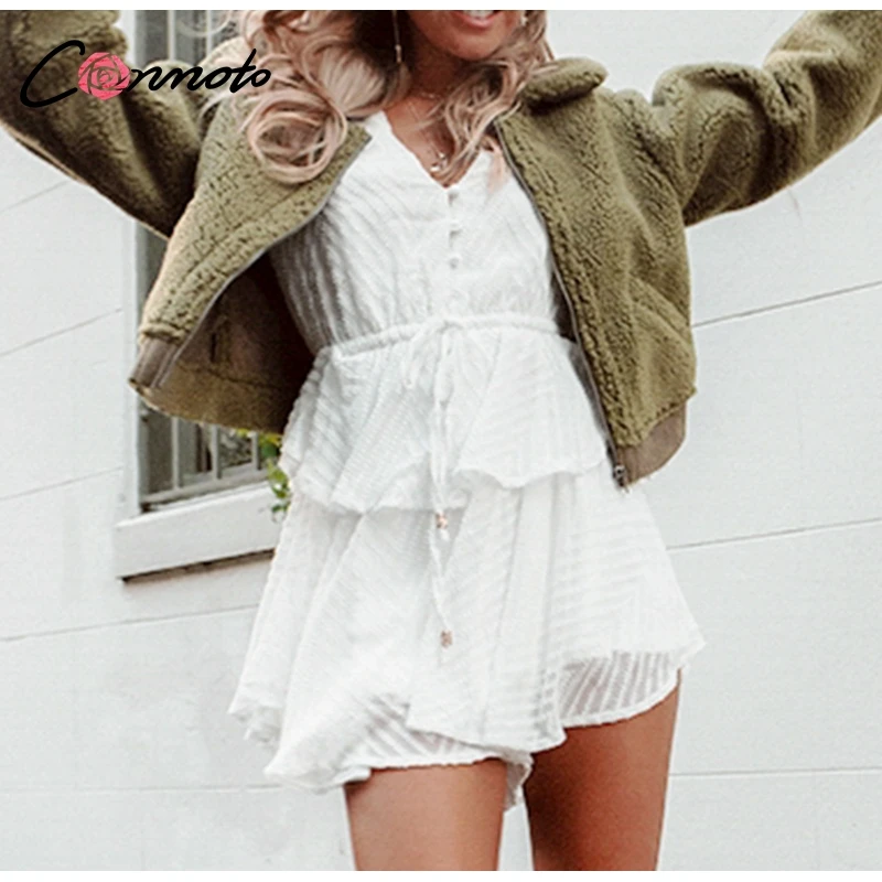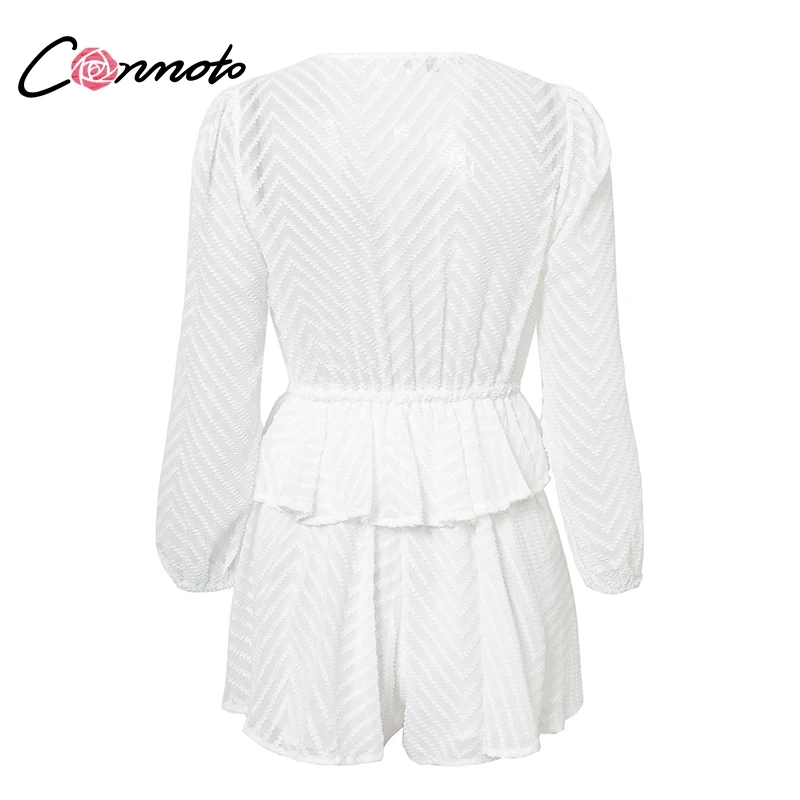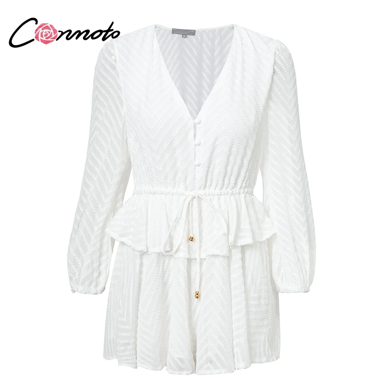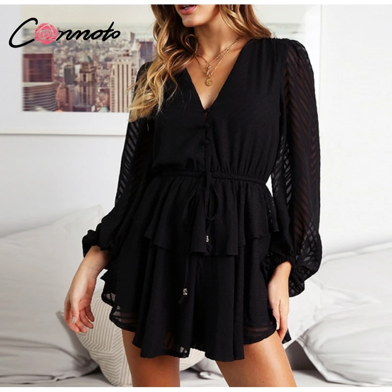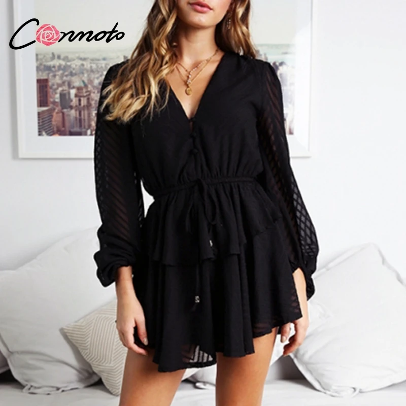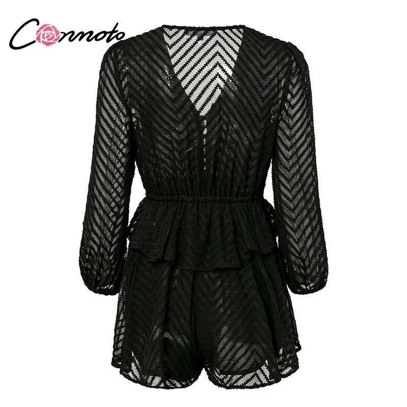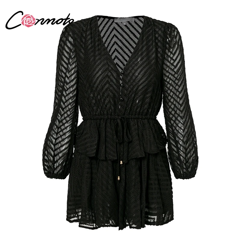 Conmoto Long Sleeve Jumpsuit Romper Women Ruffle Layered Button White Chiffon Overall Sexy Streetwear Mesh Black Playsuit
