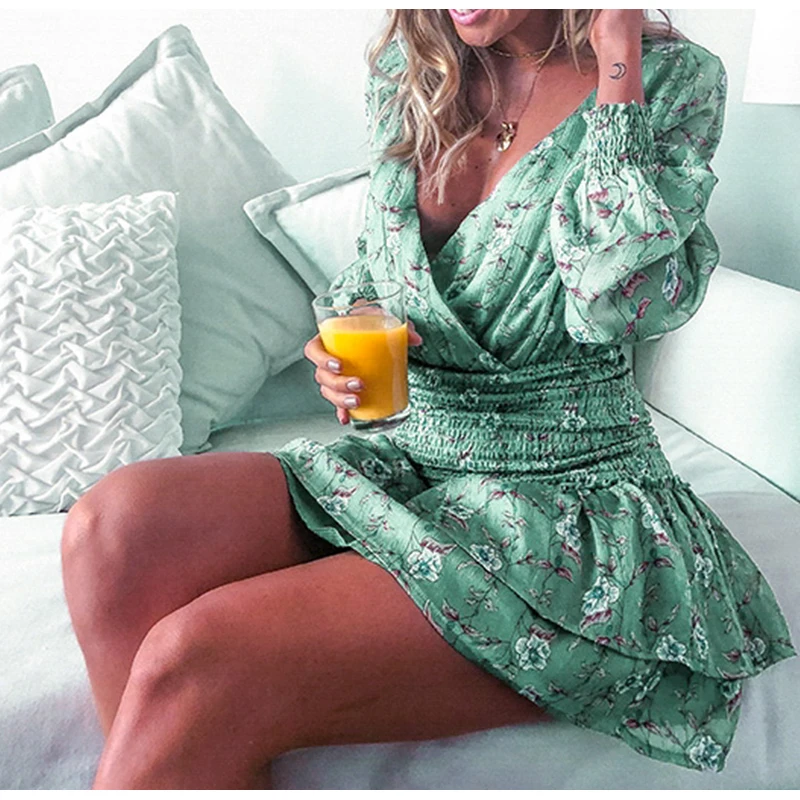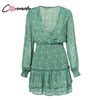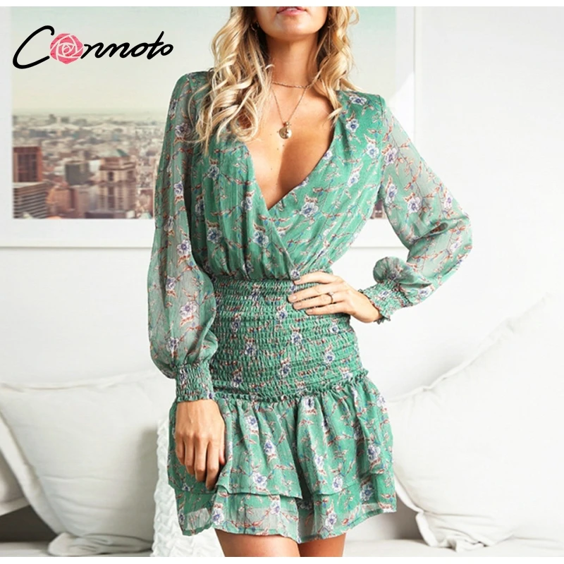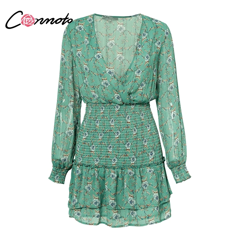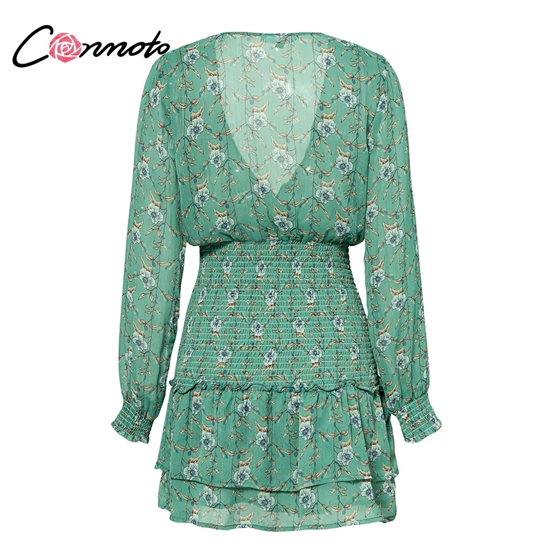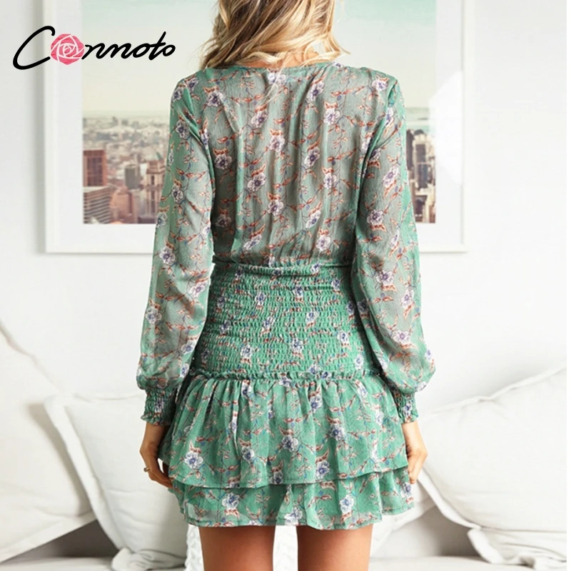 Conmoto Smocking Boho Dress Mesh Long Sleeve V Neck Sexy Mini Dress Green Ruffle Layered Short Dress Elelgant Chiffon Dress Robe