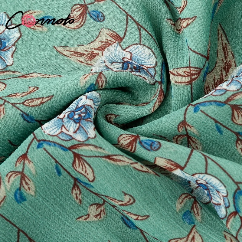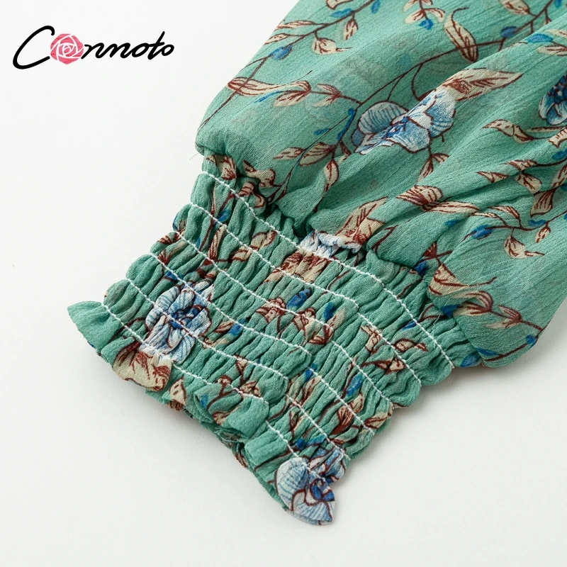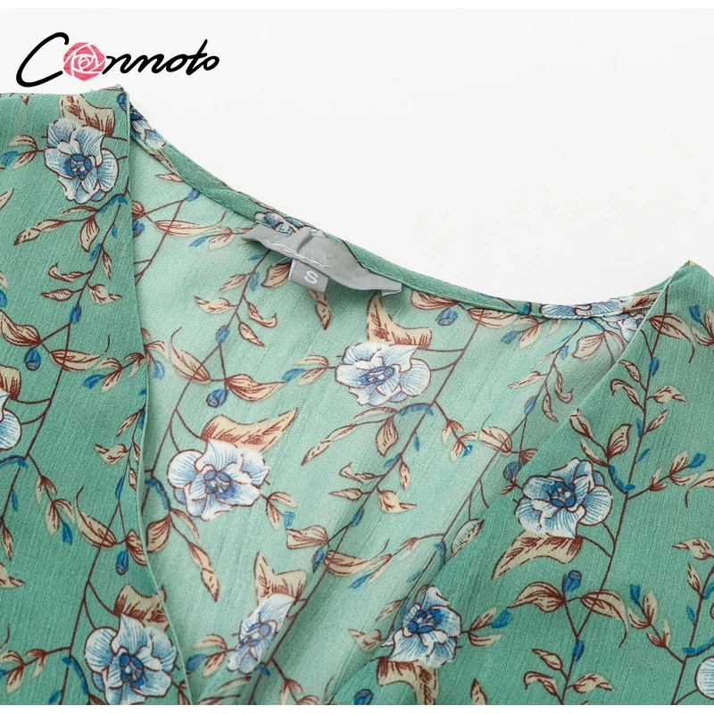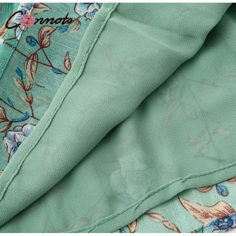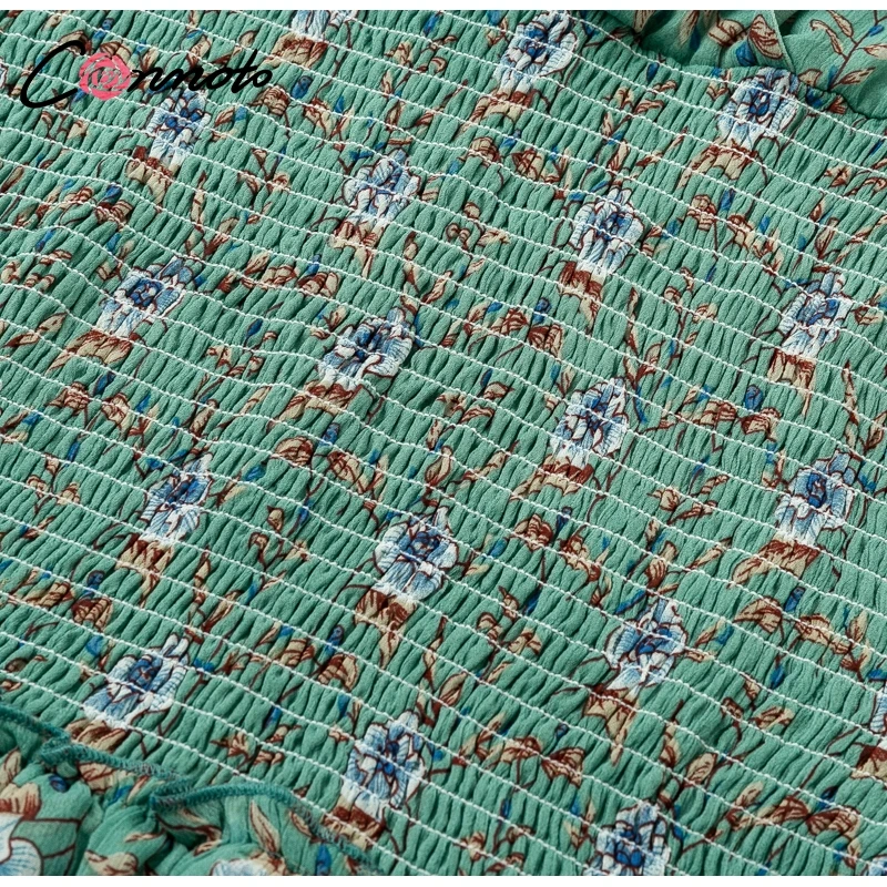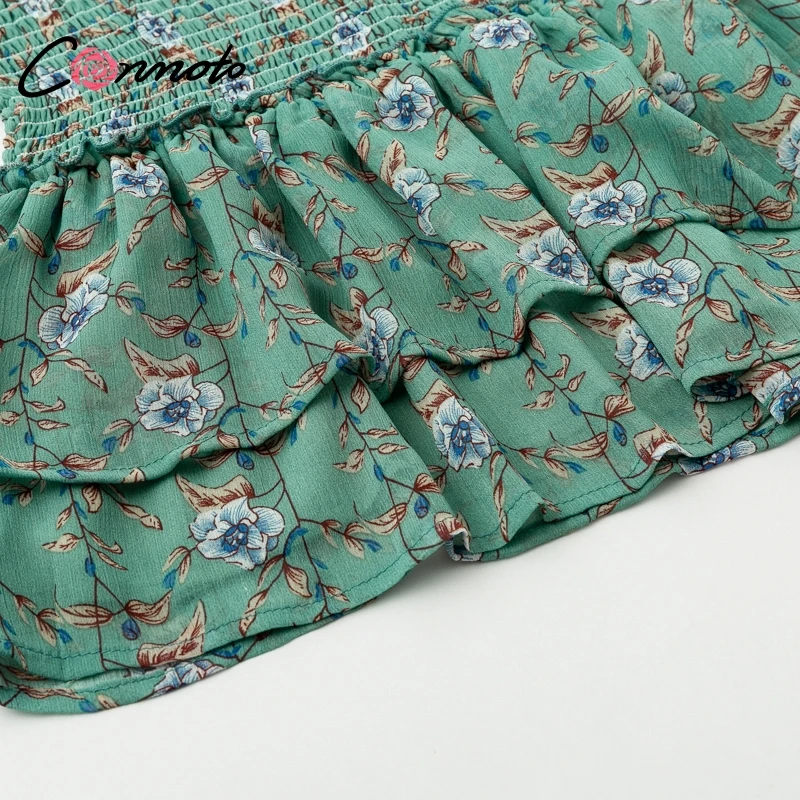 Conmoto Smocking Boho Dress Mesh Long Sleeve V Neck Sexy Mini Dress Green Ruffle Layered Short Dress Elelgant Chiffon Dress Robe