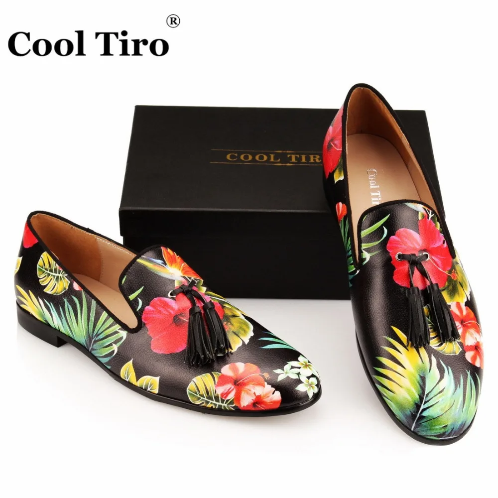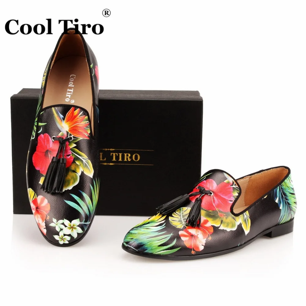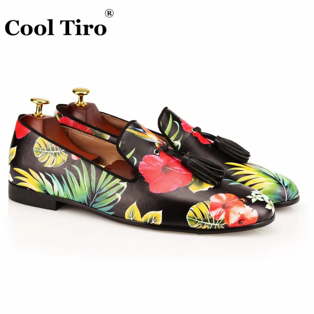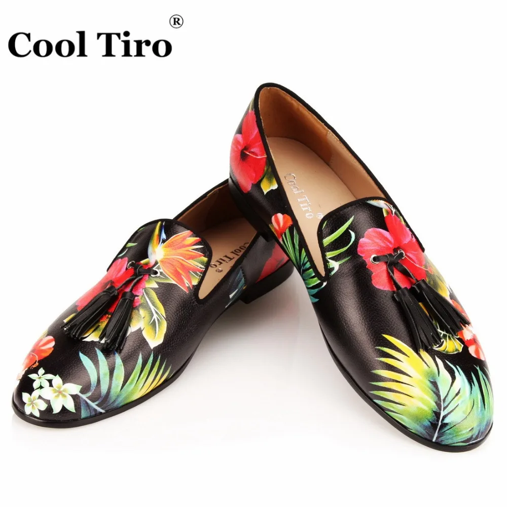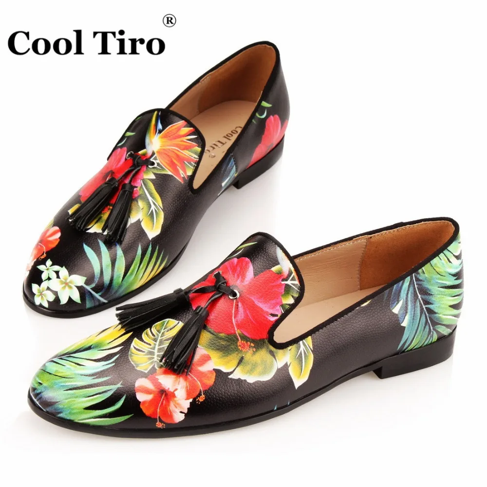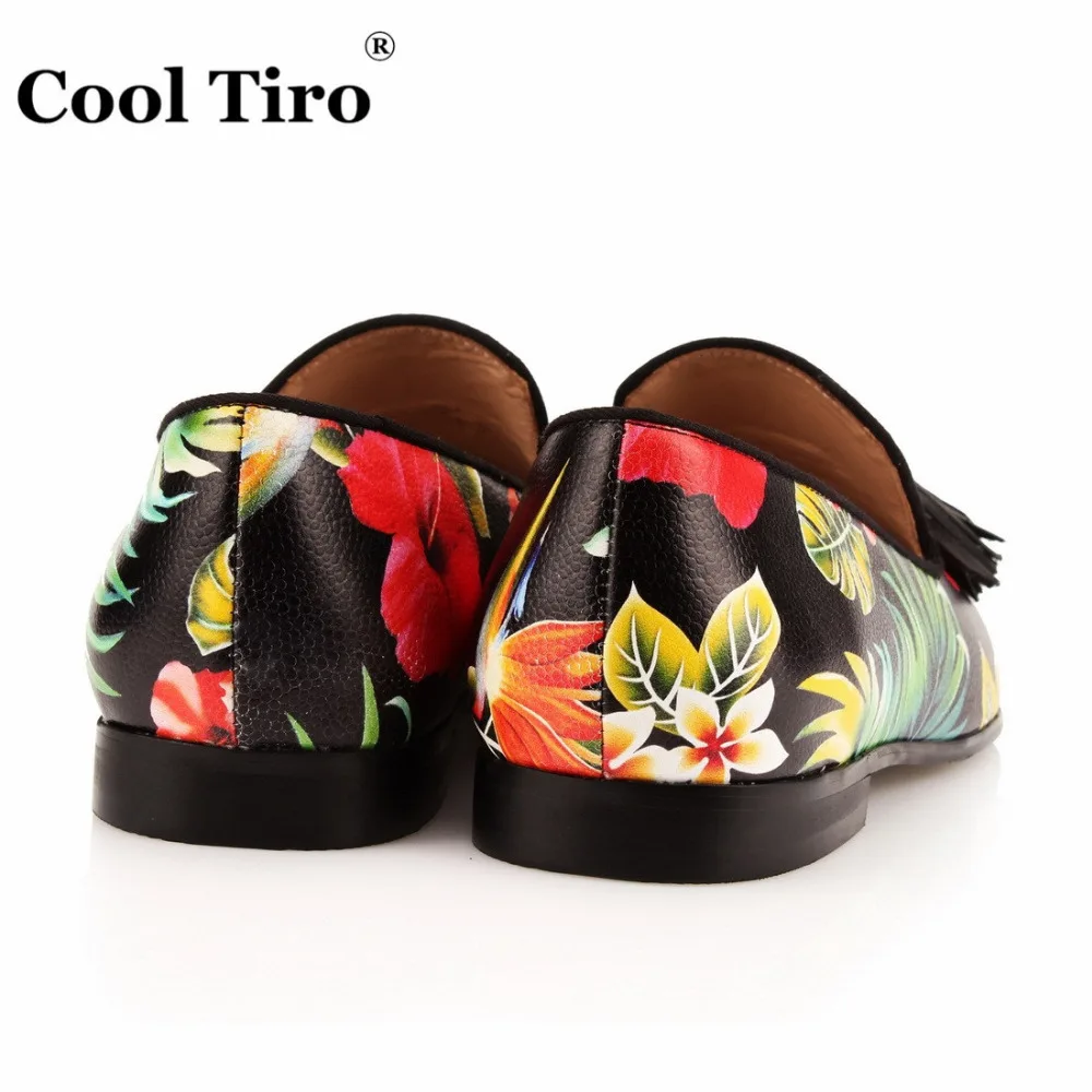 COOL TIRO Tassel Men Loafers Flowers Painted Printed Men’s Moccasins SmokingSlipper Shoes Wedding Dress Shoes Flat Real Leather