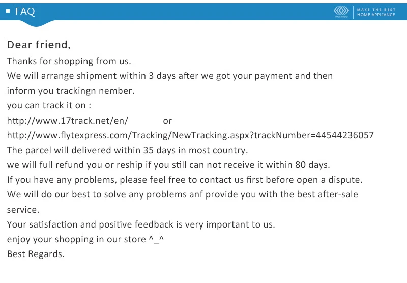 • If you did not receive the product within the guaranteed time( 45 days not including 2-5 day processing) you can request a refund or a reshipment.