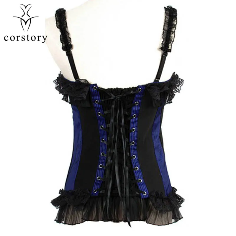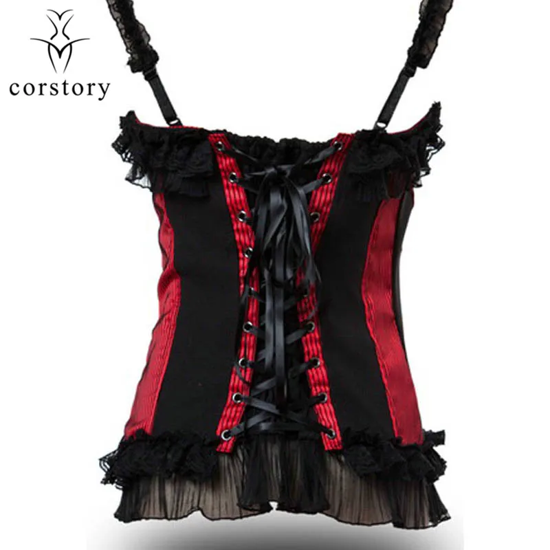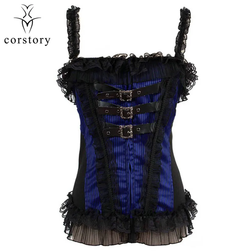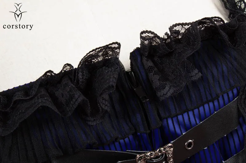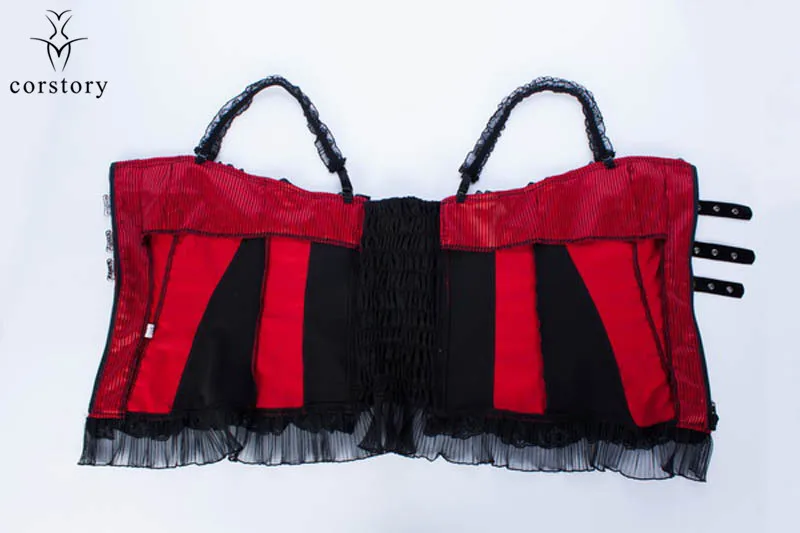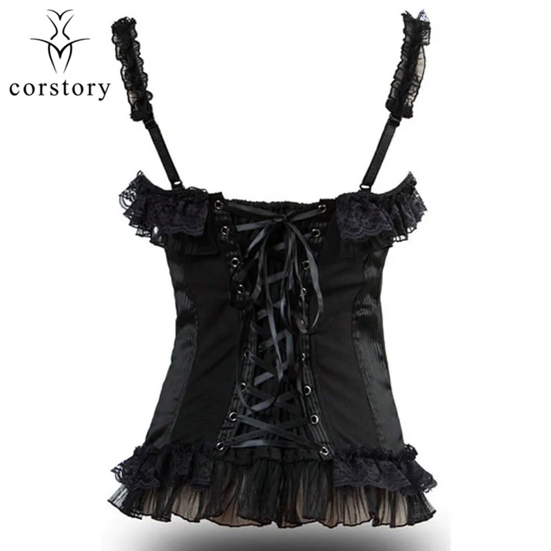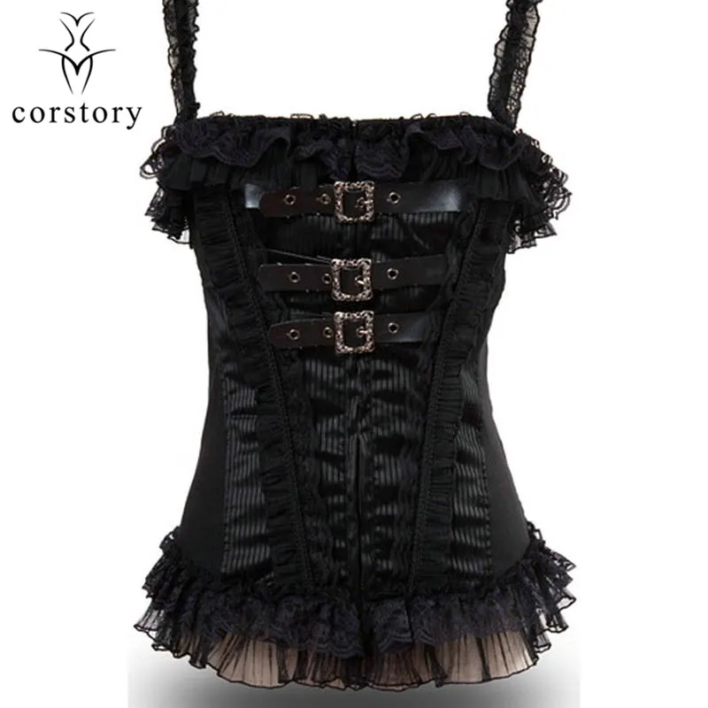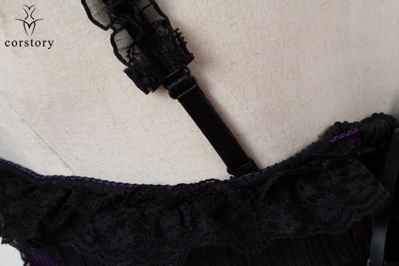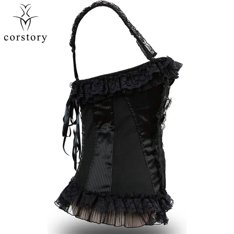 Corstory Black Satin Striped Lace Straps Overbust Corsets And Bustiers Sexy Zipper Gothic Burlesque Victorian Corsets