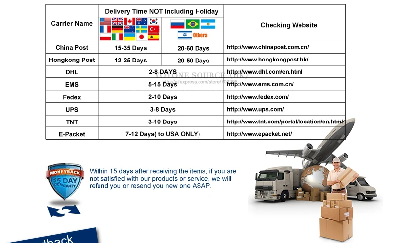 • If you did not receive the product within the guaranteed time( 45 days not including 2-5 day processing) you can request a refund or a reshipment.