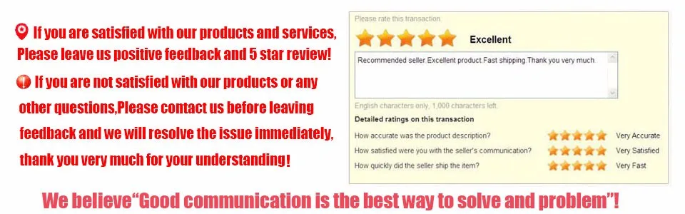 - If you are satisfied with our products and service, please give us positive feedback and good comments after you received the item, which will make us more confident to develop business and serve you better.