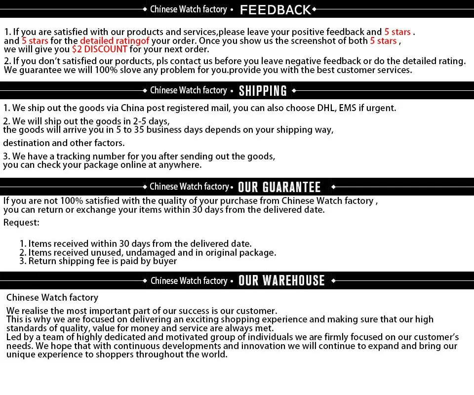 • If you did not receive the product within the guaranteed time( 45 days not including 2-5 day processing) you can request a refund or a reshipment.