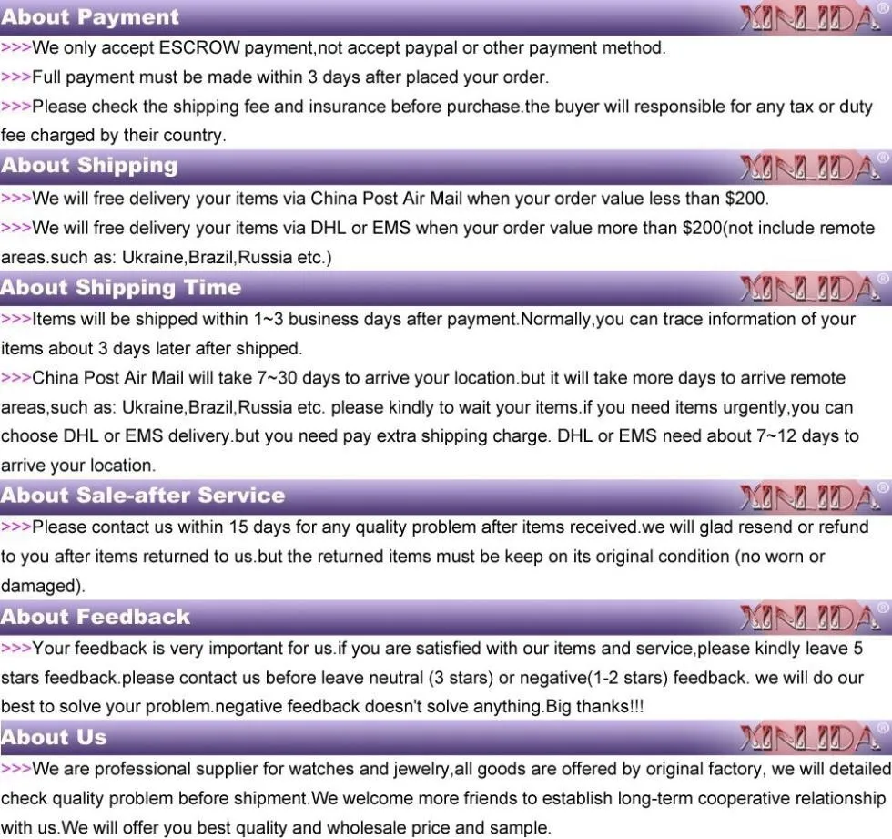 • If you did not receive the product within the guaranteed time( 45 days not including 2-5 day processing) you can request a refund or a reshipment.