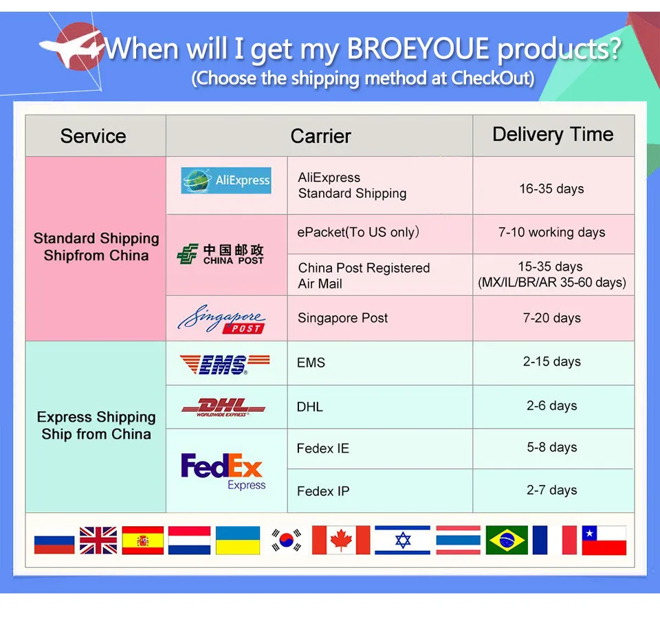 Packages from our warehouse in China will be shipped by ePacket or EMS depending on the weight and size of the product. Packages shipped from our US warehouse are shipped through USPS.