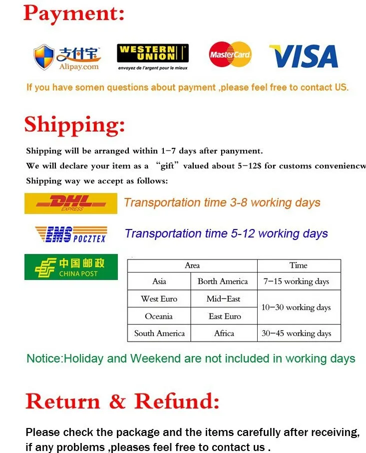 • If you did not receive the product within the guaranteed time( 45 days not including 2-5 day processing) you can request a refund or a reshipment.