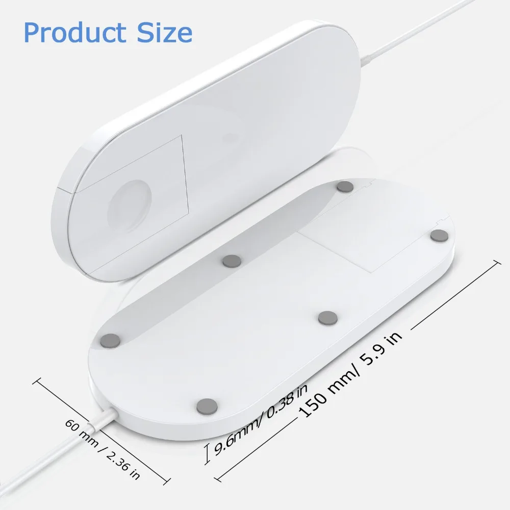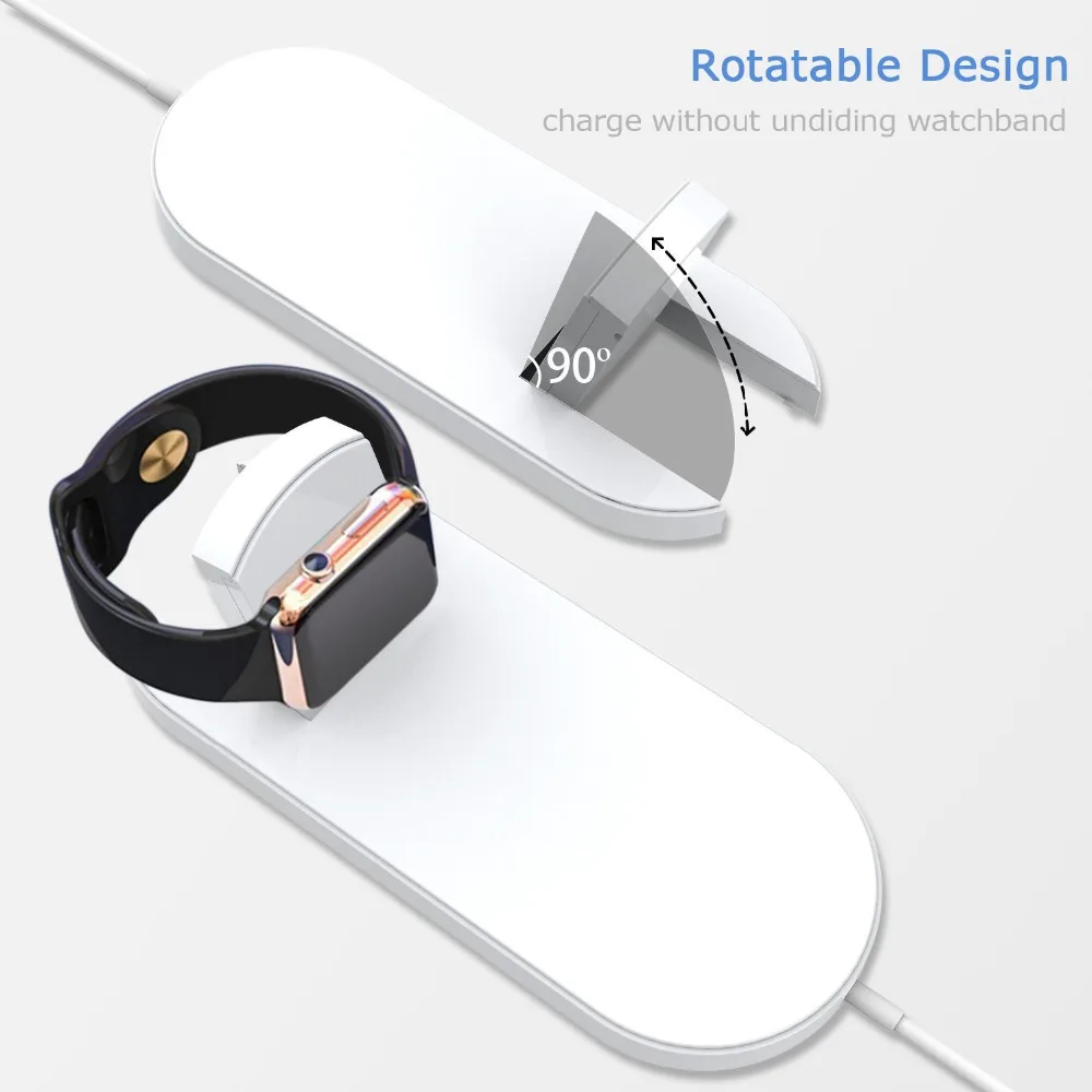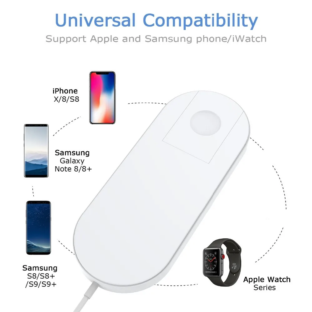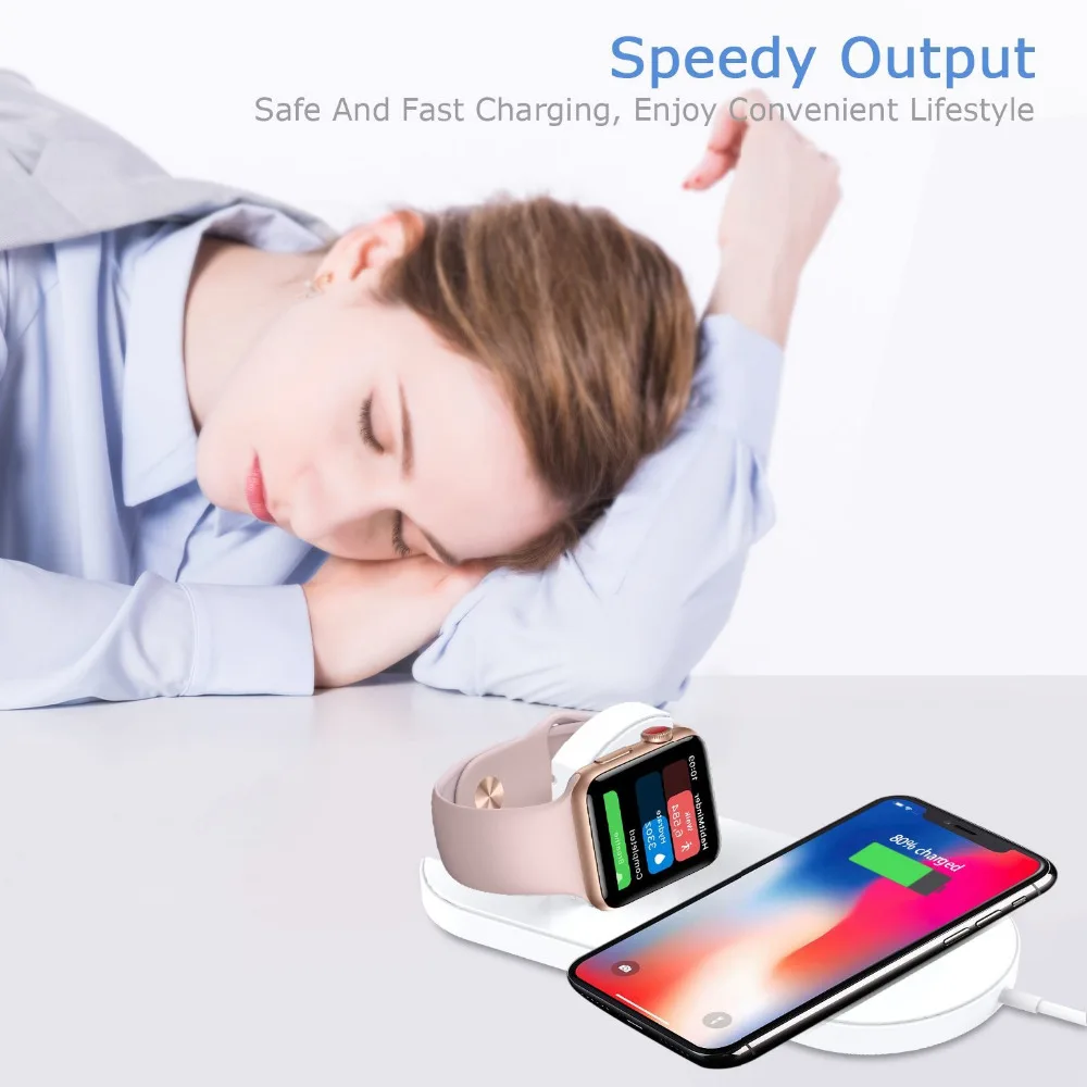 【2 in 1 MULTIFUNCTIONAL WIRELESS CHARGER】One charging pad, can charge two devices at once. Our fast wireless charger station for Apple Watch Series 1/2/3/4 and all Qi-enabled smartphone charging with high speed efficiency.