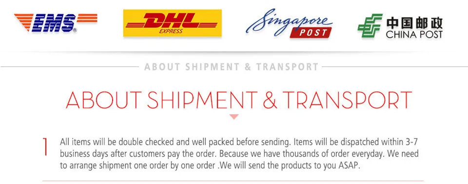 Packages from our warehouse in China will be shipped by ePacket or EMS depending on the weight and size of the product. Packages shipped from our US warehouse are shipped through USPS.