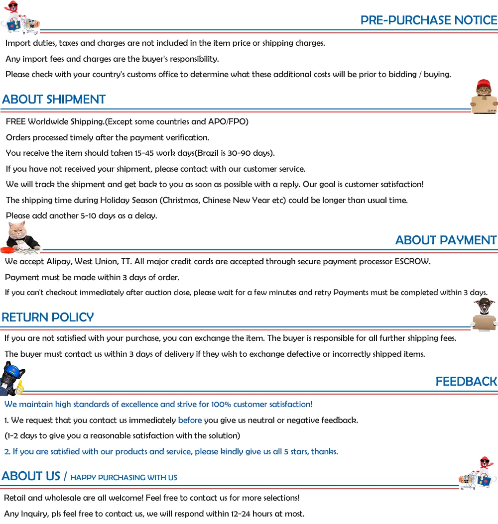 We are not responsible for any custom fees once the items have shipped. By purchasing our products, you consent that one or more packages may be shipped to you and may get custom fees when they arrive in your country.