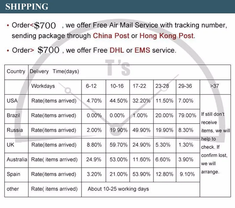 • If you did not receive the product within the guaranteed time( 45 days not including 2-5 day processing) you can request a refund or a reshipment.