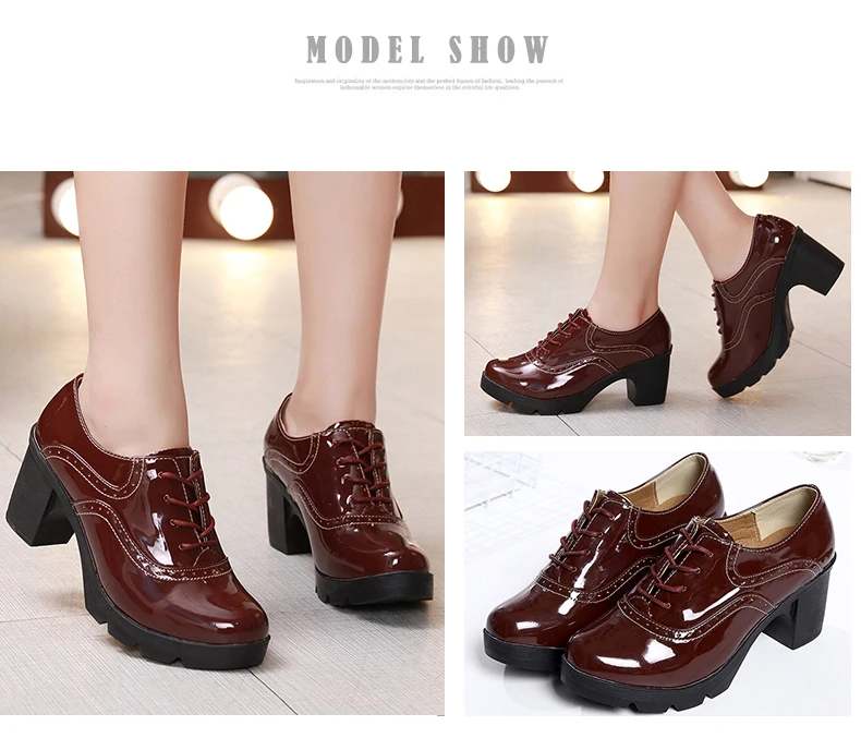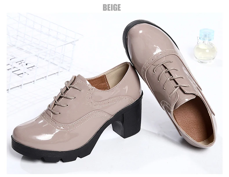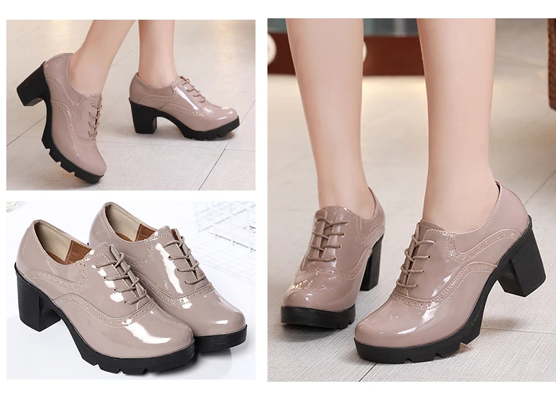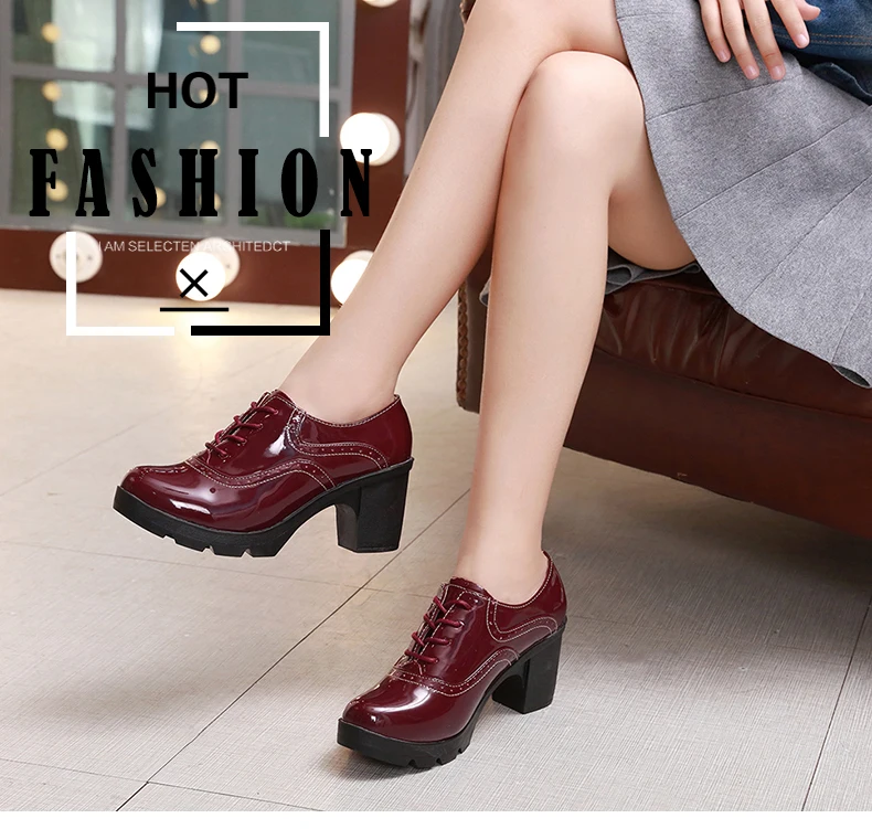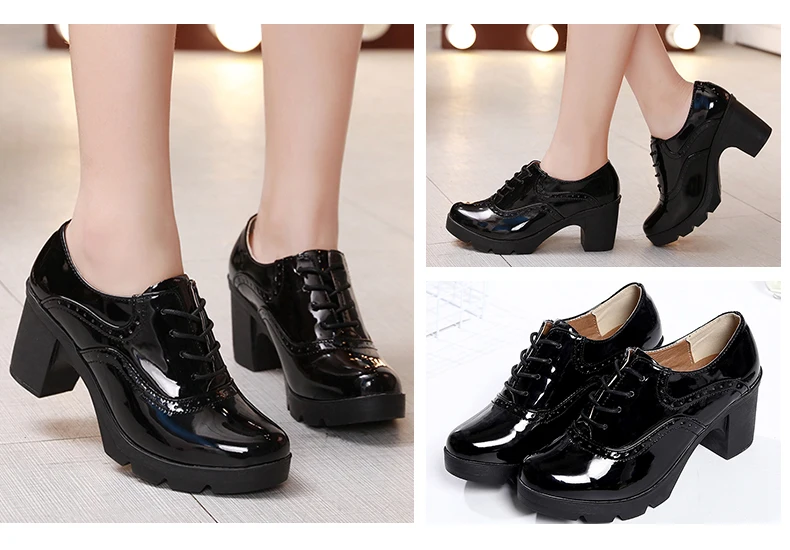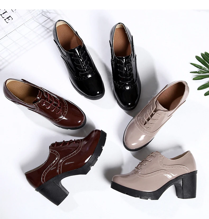 DQG 2018 Winter Women Shoes Casual Lace Up New Brogue Shoes Solid patent Leather High Heel Thick Elegrant Zapatos Tacon