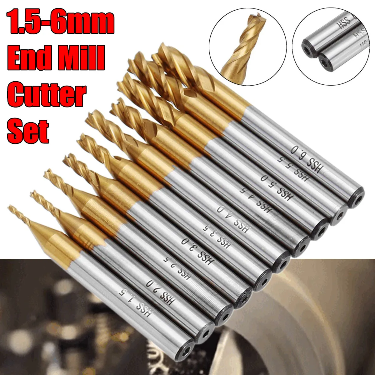 10pcs Titanium Coating 1.5-6.0mm HSS 4 Flute End Mill Cutter 6mm Straight Shank CNC Drill Bits