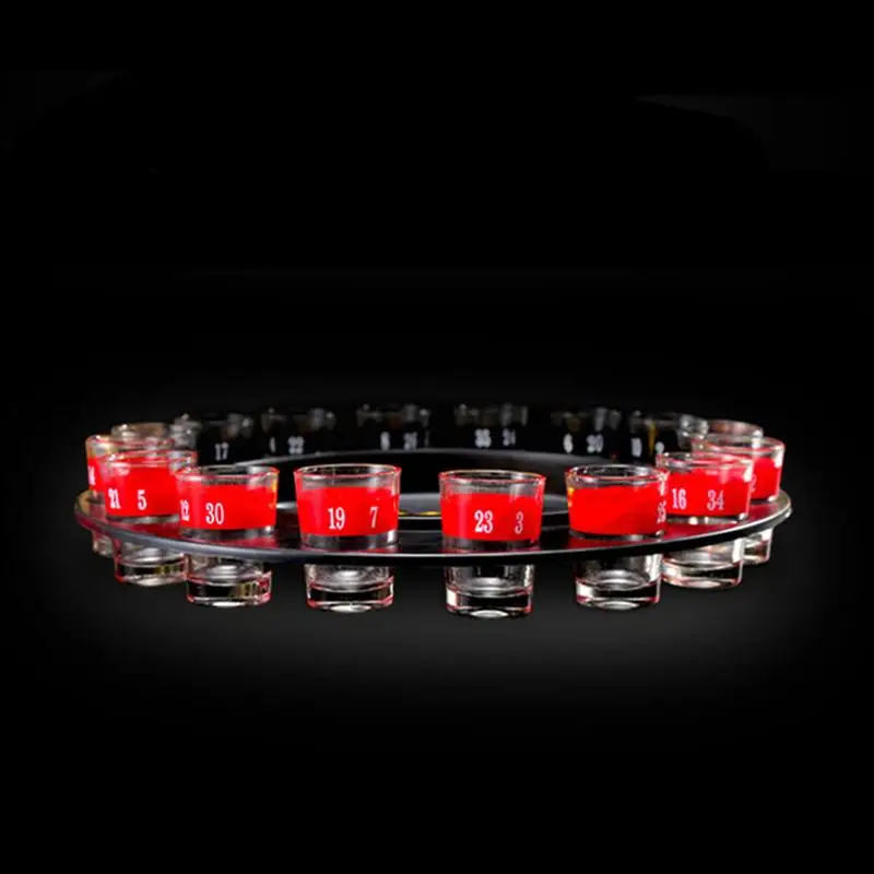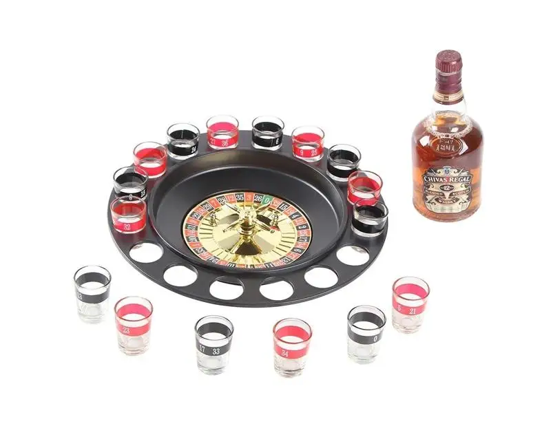 – Drinking games set contains 1 spinning roulette wheel, 16 numbered shot glasses.